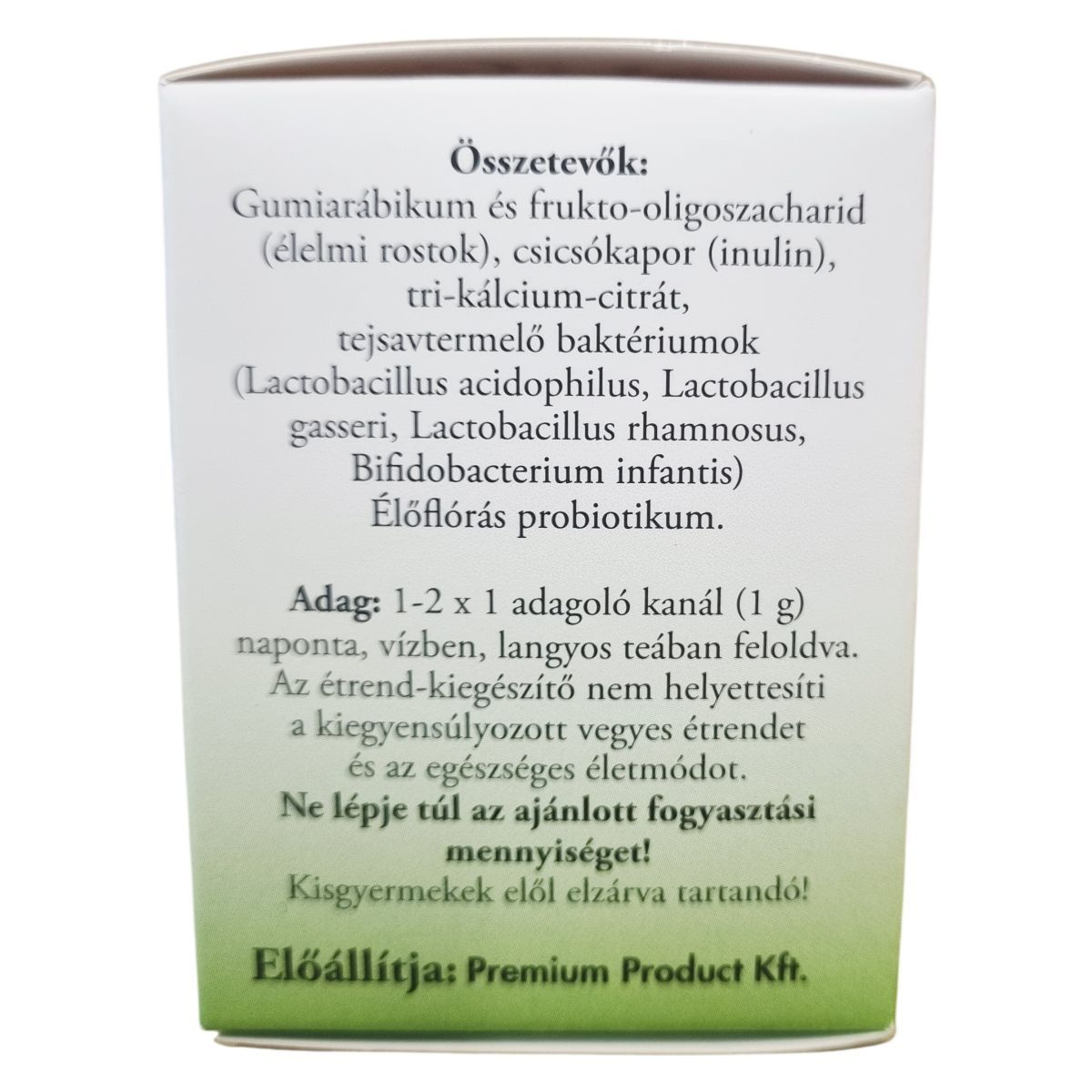 Pre- és probiotikumokat tartalmazó por, amely hozzájárulhat a bélflóra egyensúlyának fenntartásához és az emésztőrendszer normál működéséhez.
