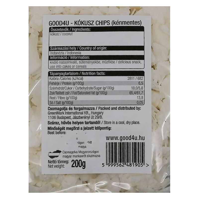 Mire jó? A kókusz chips energiatartalmának több mint 50%-át a kókuszzsír adja. Felhasználása: Kiváló magában, müzlibe, kásába keverve, desszertekhez, süteményekbe. Diéták: A kókuszzsír candida diéta során is ajánlott, a kókusz chips remek nassolnivaló fogyókúra alatt is.