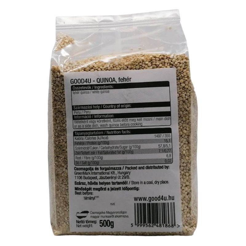 A quinoa rengeteg fontos vitamint és nyomelemet tartalmaz: különösen gazdag kalciumban, vasban, valamint káliumot, magnéziumot, B vitaminokat, C-, E-vitamint és karotint is tartalmaz. A quinoát sokan nagyon magas fehérjetartalma miatt fogyasztják. Ásványi anyagok: kálcium, vas, kálium, nátrium, foszfor, magnézium, fluor, szilícium Vitaminok: A, B1, B2, B3 Jótékony hatása: béltisztító Felhasználása: Kétszeres vízben főzzük puhára. Kiváló köretek, kásák, főételek, desszertek készítéséhez.