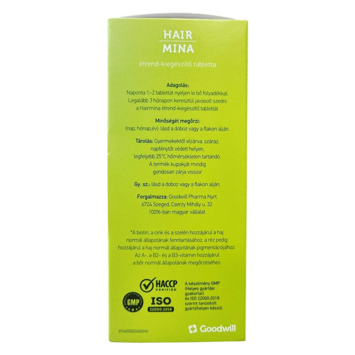 A Hair Mina étrend-kiegészítő tabletta biotint, cinket és szelént tartalmaz, melyek hozzájárulhatnak a haj normál állapotának fenntartásához, valamint rezet, amely hozzájárulhat a haj normál pigmentációjához. Az A-, B2- és B3-vitaminok támogathatják a bőr normál állapotának megőrzését. A készítmény GMP (Helyes gyártási gyakorlat) és ISO 22000:2018 szabvány szerint tanúsított gyártóhelyen készül, megőrzendő a minőségét a doboz vagy a flakon alján feltüntetett jelzés szerint. Forgalmazója a 100%-ban magyar tulajdonú Goodwill Pharma Nyrt., amely biztosítja a termék magas minőségét és biztonságát.