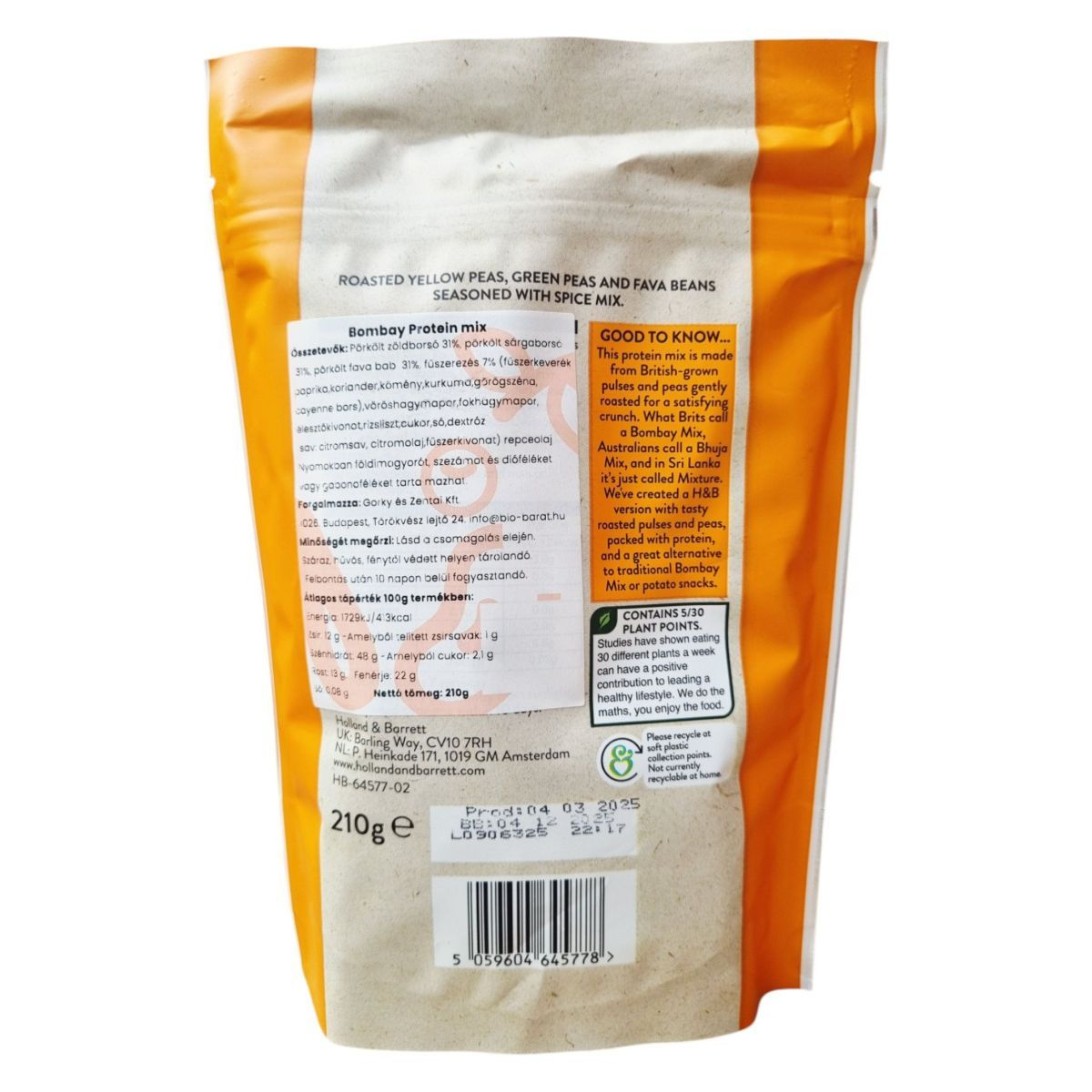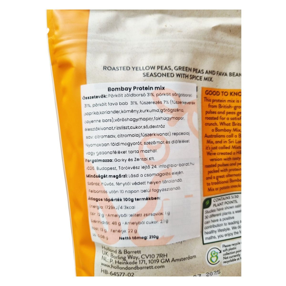 A Bombay Protein mix brit termesztésű hüvelyesekből és borsóból készült ropogós, indiai jellegű fűszerezésű keverék. Magas fehérjetartalmú, pörköléssel készült termék.