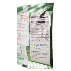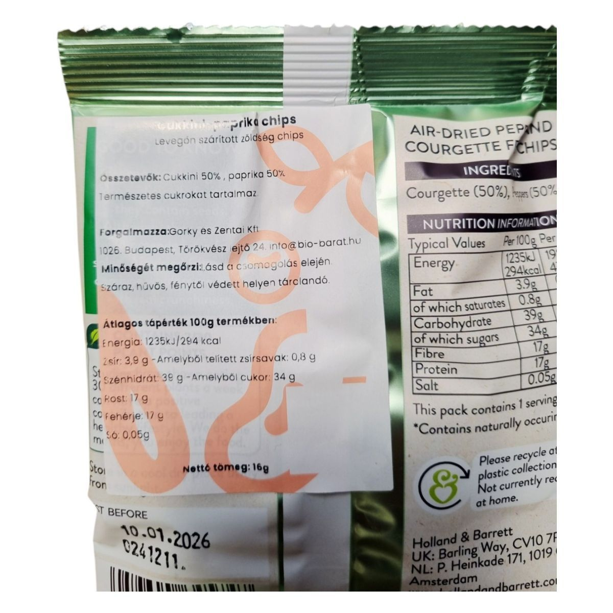 A H&B Courgette & Pepper Chips egy innovatív snack, amely cukkini és paprika felhasználásával készült. A termék levegőn szárított, így megőrizheti a zöldségek természetes ízét és tápanyagait. A chips magas rost- és fehérjetartalmú, alacsony telített zsírtartalommal rendelkezik, és nem tartalmaz hozzáadott cukrot vagy tartósítószert. A termék 47 kcal-t tartalmaz adagonként (16g), és természetes cukrokat tartalmazhat. A csomagolás újrahasznosítható a puha műanyag gyűjtőpontokon, de otthon nem újrahasznosítható.