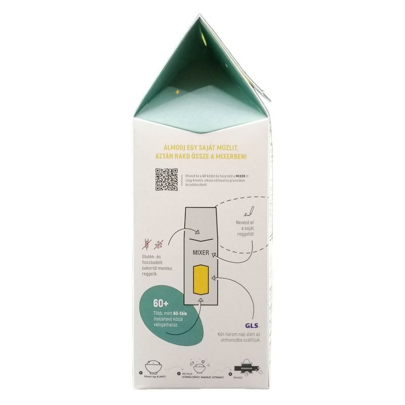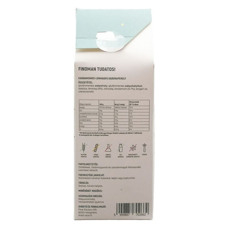 Egy adaggal (60g) gondoskodhatunk a napi rostbevitelünk 24%-ról. Hozzáadott cukrot nem tartalmaz, glutén-, szója-, tej-, színezék-, tartósítószer-mentes. Vegán étrendbe beilleszthető. Élelmi rostban gazdag. Átlagos tápérték 100g termékben: Energia 1777 kJ, 425 kcal, Zsír 16 g, amelyből telített zsírsavak 2,2 g, Szénhidrát 59 g, amelyből cukrok 13 g, Rost 10 g, Fehérje 11 g , Só 0,61 g. Összetétel: gluténmentes zabpehely, gluténmentes zabpehelyliszt, datolya, lenmag (9%), olívaolaj,kardamom (0,7%), tengeri só, szerecsendió.