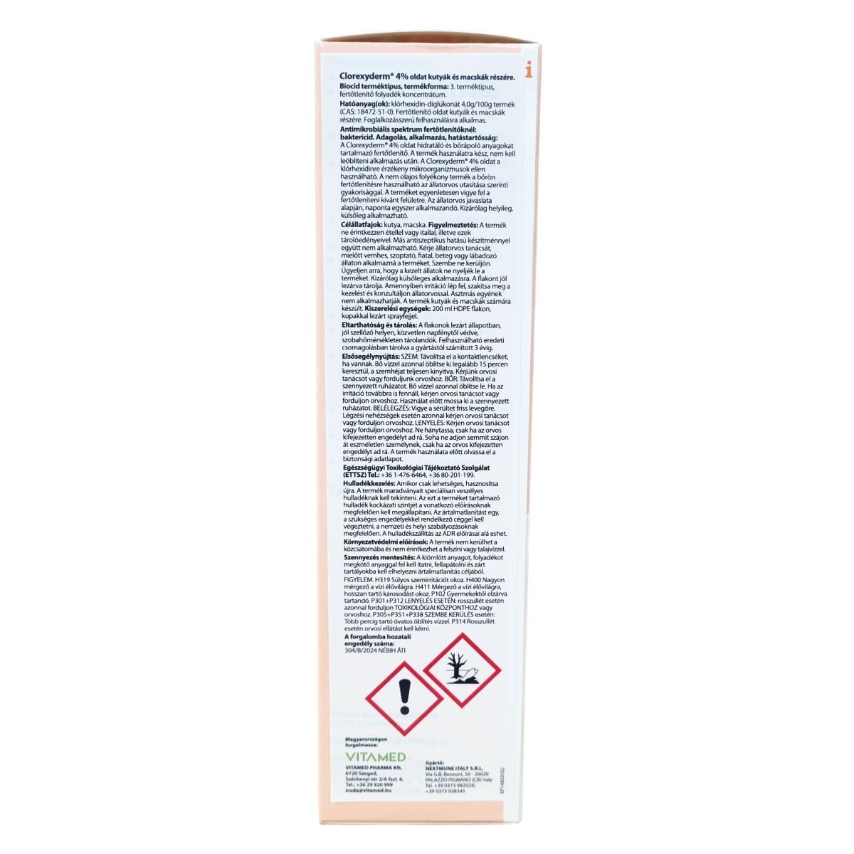 Biocid terméktípus, termékforma: 3. terméktípus, fertőtlenítő folyadék koncentrátum. Fertőtlenítő oldat kutyák és macskák részére. Foglalkozásszerű felhasználásra alkalmas. Antimikrobiális spektrum fertőtlenítőknél: baktericid. A Clorexyderm® soluzione 4% klórhexidin-diglükonát alapú fertőtlenítő, amely hidratáló és emolliens anyagokat tartalmaz, nem igényel leöblítést az alkalmazás után. Klórhexidinre érzékeny mikroorganizmusok ellen aktív. Folyékony, nem olajos formulája lehetővé teszi kiterjedt bőrfelületek fertőtlenítését és az egymáshoz közeli időközönként végzett kezeléseket. Célállatfajok: kutya, macska. Kiszerelési egységek: 200 ml HDPE flakon, kupakkal lezárt sprayfejjel.