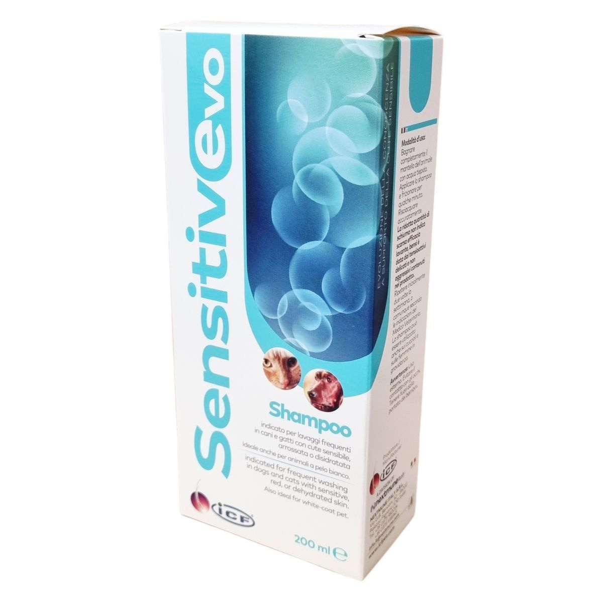 A Sensitive Evo sampon rendszeres használata nyugtató, hidratáló és védő hatású, támogatja a bőr fiziológiás állapotát és a hidrolipid védőréteg helyreállítását. A D-pantenol segítheti a bőr regenerációját és a szőrtüszők hidratáltságát, míg a karbamid fenntartja a rugalmasságot. A ceramidok erősítik a bőr védővonalát, a selyemprotein pedig puhítja a szőrzetet és könnyíti a fésülést. Az erdei deréce bőrpuhító hatású, az organikus édesgyökér és feketebodza kivonatok pedig jelentősen csökkenthetik a viszketést. Ideális fehér szőrű állatok számára is. A fel nem használt terméket a helyi előírásoknak megfelelően kell megsemmisíteni.