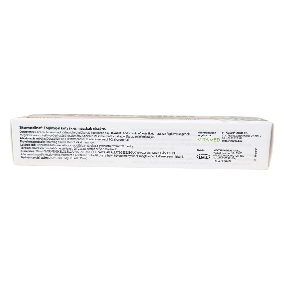 A Stomodine® egy 0,12%-os klórhexidin tartalmú fogínygél, amely kifejezetten kutyák és macskák részére készült. Összetevői között megtalálható a glicerin, húsaroma és ligetszépe olaj, amelyek együtt segíthetik a kellemes ízvilágot és a készítmény jó tolerálhatóságát az állatok számára. A termék célja a fogkő kialakulásának megelőzése, és használati utasítása szerint napi 1-2 alkalommal az állat ínyébe kell bedörzsölni. A készítményt kizárólag állategészségügyi vagy állatápolási célra szabad használni, és gyermekektől elzárva kell tartani. Tárolása száraz, szobahőmérsékletű, 25°C alatti helyen javasolt. A fel nem használt terméket és a keletkező hulladékot a helyi előírásoknak megfelelően kell megsemmisíteni. A termék gyártója az olasz NEXTMUNE ITALY S.R.L., forgalmazója pedig a VITAMED PHARMA Kft. Magyarországon.