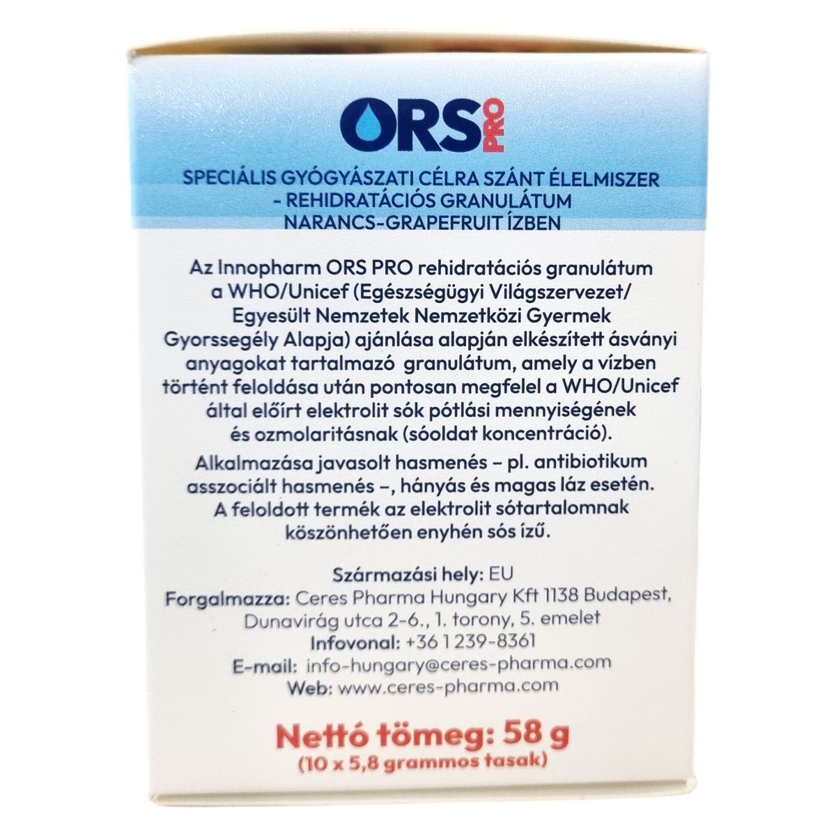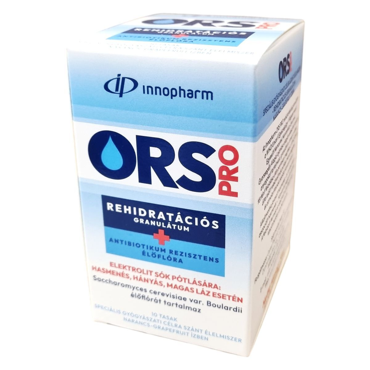 Az Innopharm ORS PRO rehidratációs granulátum a WHO/Unicef ajánlása alapján készített ásványi anyagokat tartalmazó termék, amely a vízben történő feloldás után megfelel az előírt elektrolit sók pótlási mennyiségének és ozmolaritásnak. A termék alkalmazása javasolt hasmenés, például antibiotikum asszociált hasmenés, hányás és magas láz esetén, mivel elektrolit tartalmának köszönhetően hozzájárulhat az elektrolit-háztartás helyreállításához. A granulátum enyhén sós ízű, narancs-grapefruit ízesítésű, és 10 db tasak kiszerelésben érhető el. A Saccharomyces cerevisiae var. boulardii élőflórait tartalmazó készítmény speciális gyógyászati célra szánt élelmiszer, amely az elektrolitok mellett probiotikus élőflórát is biztosít.