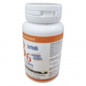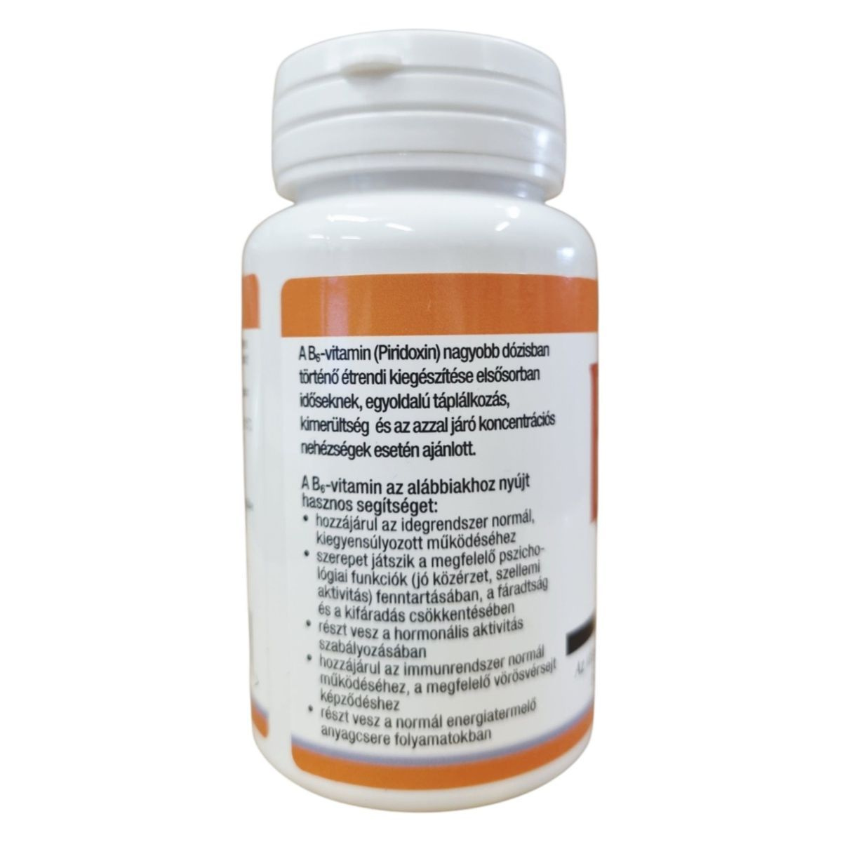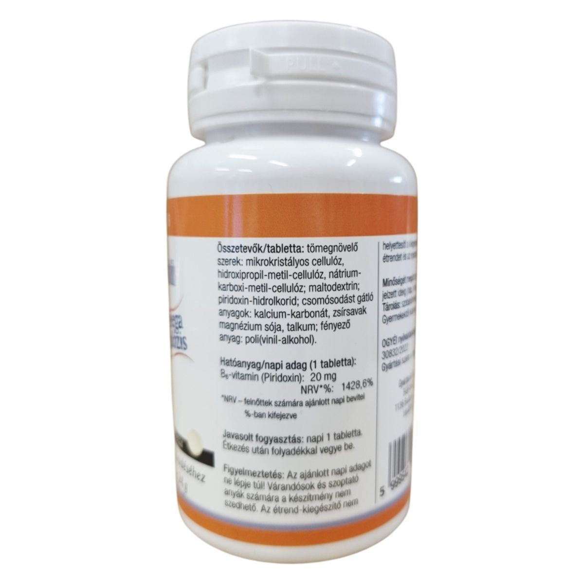 A B6 mega dózis VITAMIN étrend-kiegészítő tabletta a B6-vitamin nagy dózisú pótlását biztosíthatja, amely különösen idősek, egyoldalú táplálkozás, kimerültség és az azzal járó koncentrációs nehézségek esetén lehet hasznos. A B6-vitamin hozzájárulhat az idegrendszer normál, kiegyensúlyozott működéséhez, a pszichológiai funkciók fenntartásához, a fáradtság csökkentéséhez, valamint az immunrendszer és a hormonális aktivitás szabályozásához. A termék 60 tablettát tartalmaz, és a napi ajánlott mennyiség egy tabletta, amelyet étkezés után, folyadékkal kell bevenni.