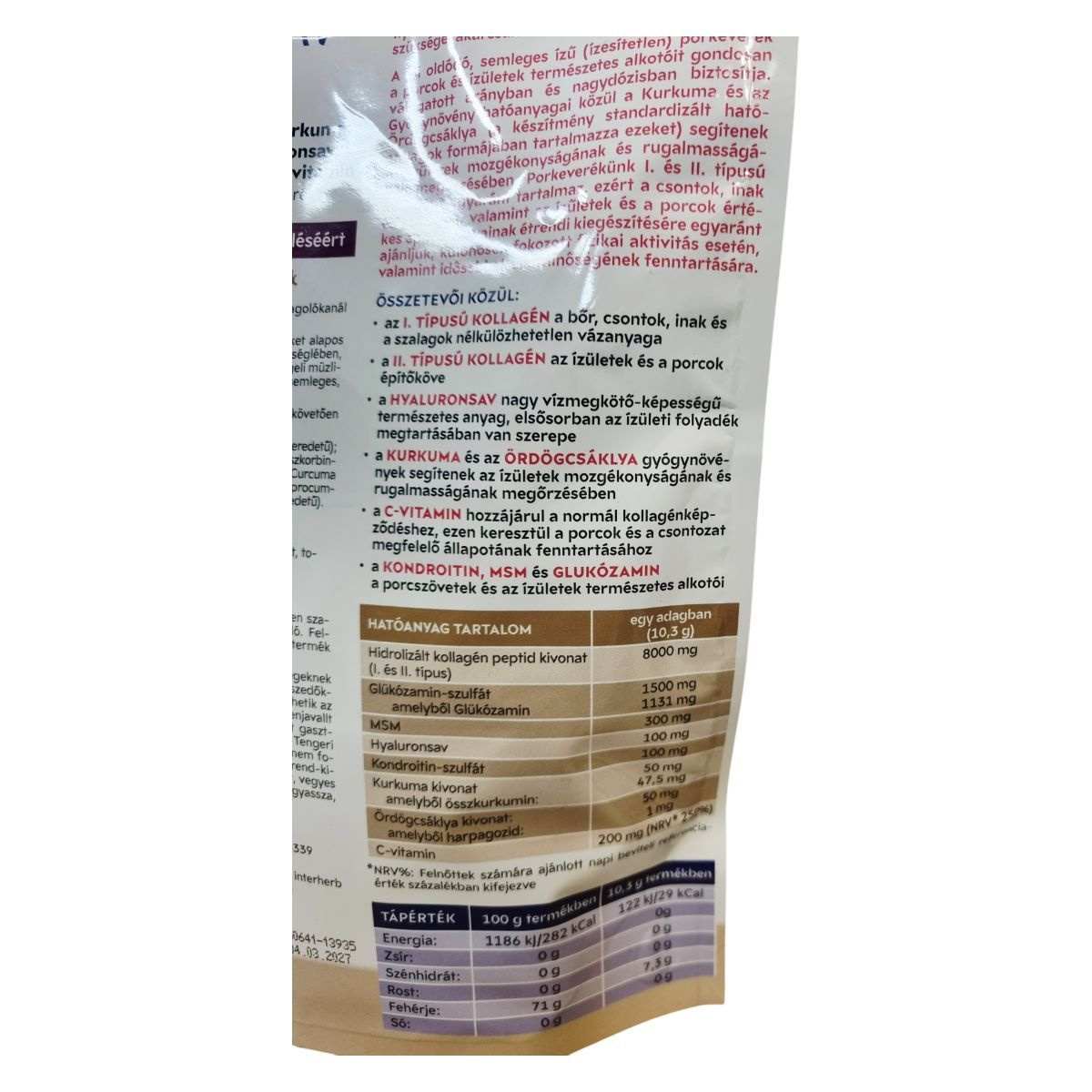 Hidrolizált kollagén kivonat (szarvasmarha eredetű), glükózamin-szulfát, metil-szulfonil-metán (MSM), L-aszkorbinsav, nátrium-hialuronát, kondroitin-szulfát, kurkuma (Curcuma longa) gyökérkivonat, Ördögcsáklya (Harpagophytum procumbens) gyökérkivonat, hidrolizált kollagén kivonat (csirke eredetű)