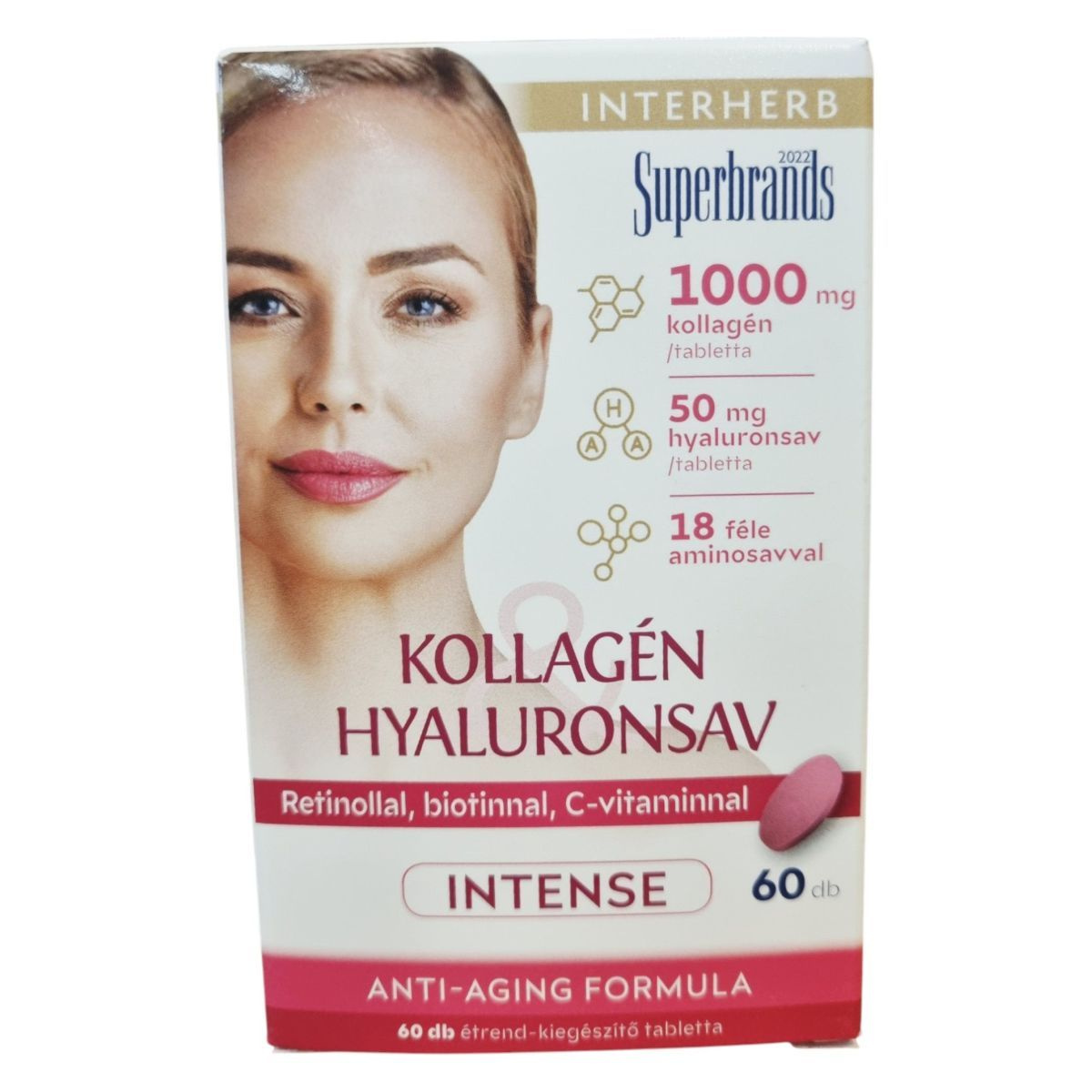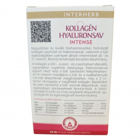 Az INTERHERB KOLLAGÉN & HYALURONSAV INTENSE egy komplex étrend-kiegészítő, amely hidrolizált kollagén peptidet és hyaluronsavat tartalmaz. Ezek az összetevők hozzájárulhatnak a bőr szerkezeti felépítéséhez és rugalmasságához. A termék A-vitamint, C-vitamint és biotint is tartalmaz, amelyek támogathatják a bőr és a haj egészségét. Az étrend-kiegészítő szarvasmarha eredetű kollagént tartalmaz, és szabadalmaztatott technológiával készült, hogy magas hatásfokkal hasznosuljon a szervezetben. A termék 60 tablettát tartalmaz, és napi egy tabletta fogyasztása javasolt.