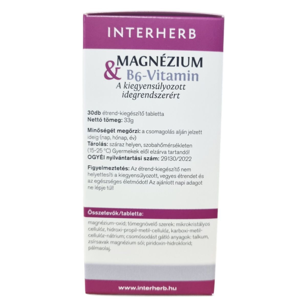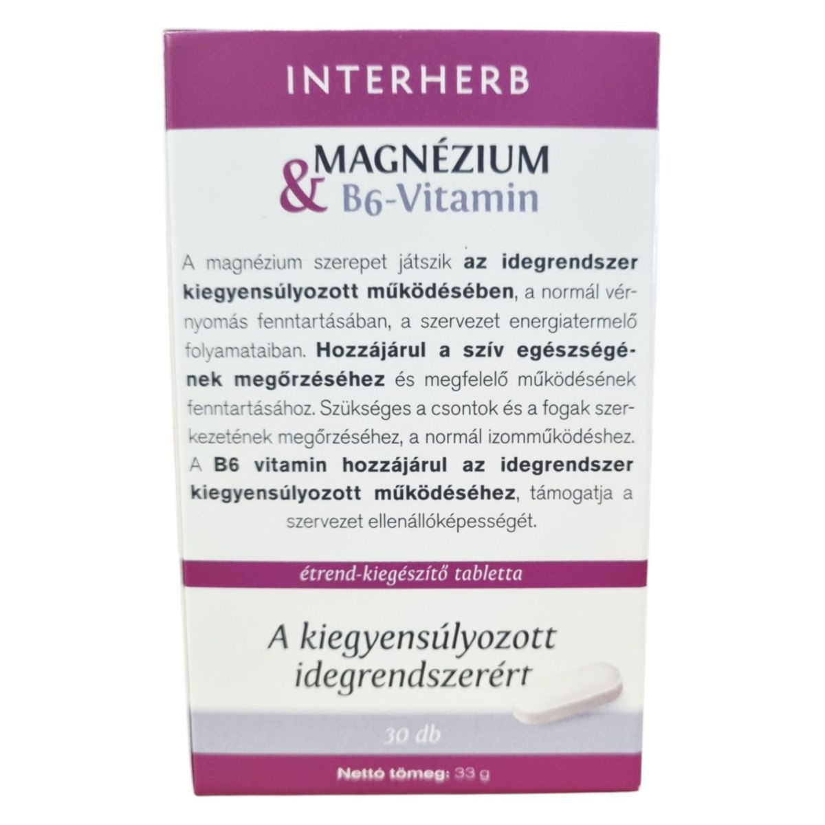 Az INTERHERB MAGNÉZIUM & B6-Vitamin étrend-kiegészítő tabletta célja, hogy támogassa az idegrendszer kiegyensúlyozott működését és a normál vérnyomás fenntartását. A magnézium hozzájárulhat a szív egészségének megőrzéséhez, a csontok és fogak szerkezetének fenntartásához, valamint a normál izomműködéshez. A B6-vitamin segíthet az immunrendszer támogatásában. A termék 30 tablettát tartalmaz, és napi egy tabletta fogyasztása javasolt. A termék minőségét a csomagolás alján jelzett ideig őrzi meg.