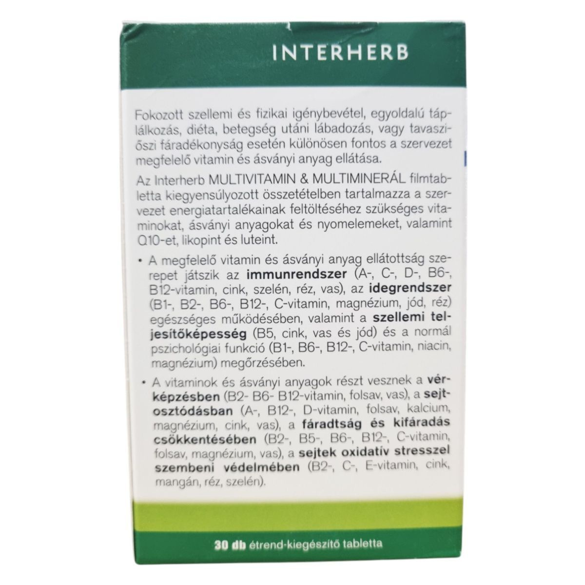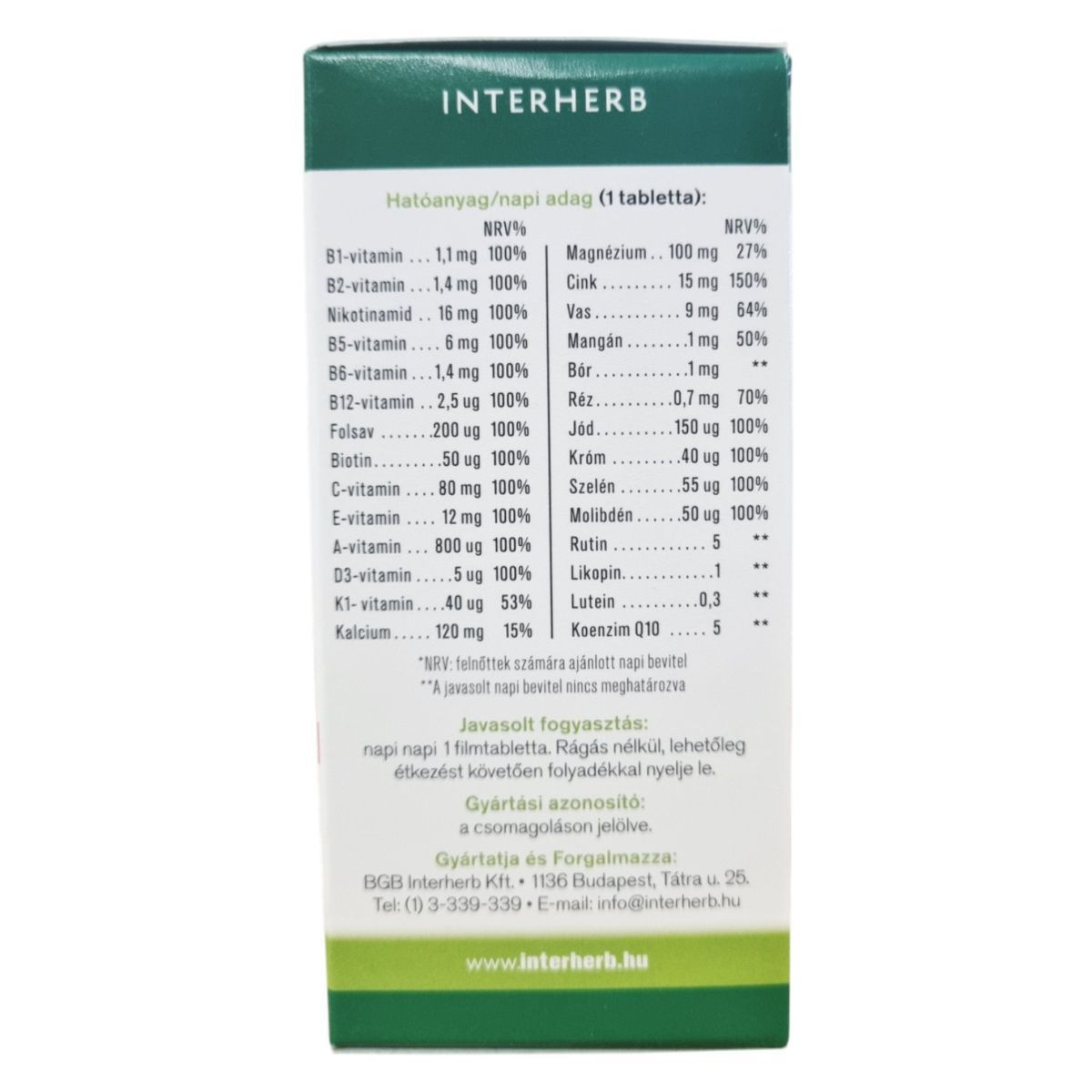 Az INTERHERB MULTIVITAMIN MULTIMINERÁL filmtabletta egy komplex étrend-kiegészítő, amely 28 különböző hatóanyagot tartalmazhat, beleértve a vitaminokat, ásványi anyagokat és nyomelemeket. A termék különösen hasznos lehet fokozott szellemi és fizikai igénybevétel, egyoldalú táplálkozás, diéta, betegség utáni lábadozás, vagy tavaszi-őszi fáradékonyság esetén. A vitaminok és ásványi anyagok szerepet játszhatnak az immunrendszer és az idegrendszer egészséges működésében, a szellemi teljesítőképesség és a normál pszichológiai funkció megőrzésében, valamint a fáradtság és kifáradás csökkentésében.