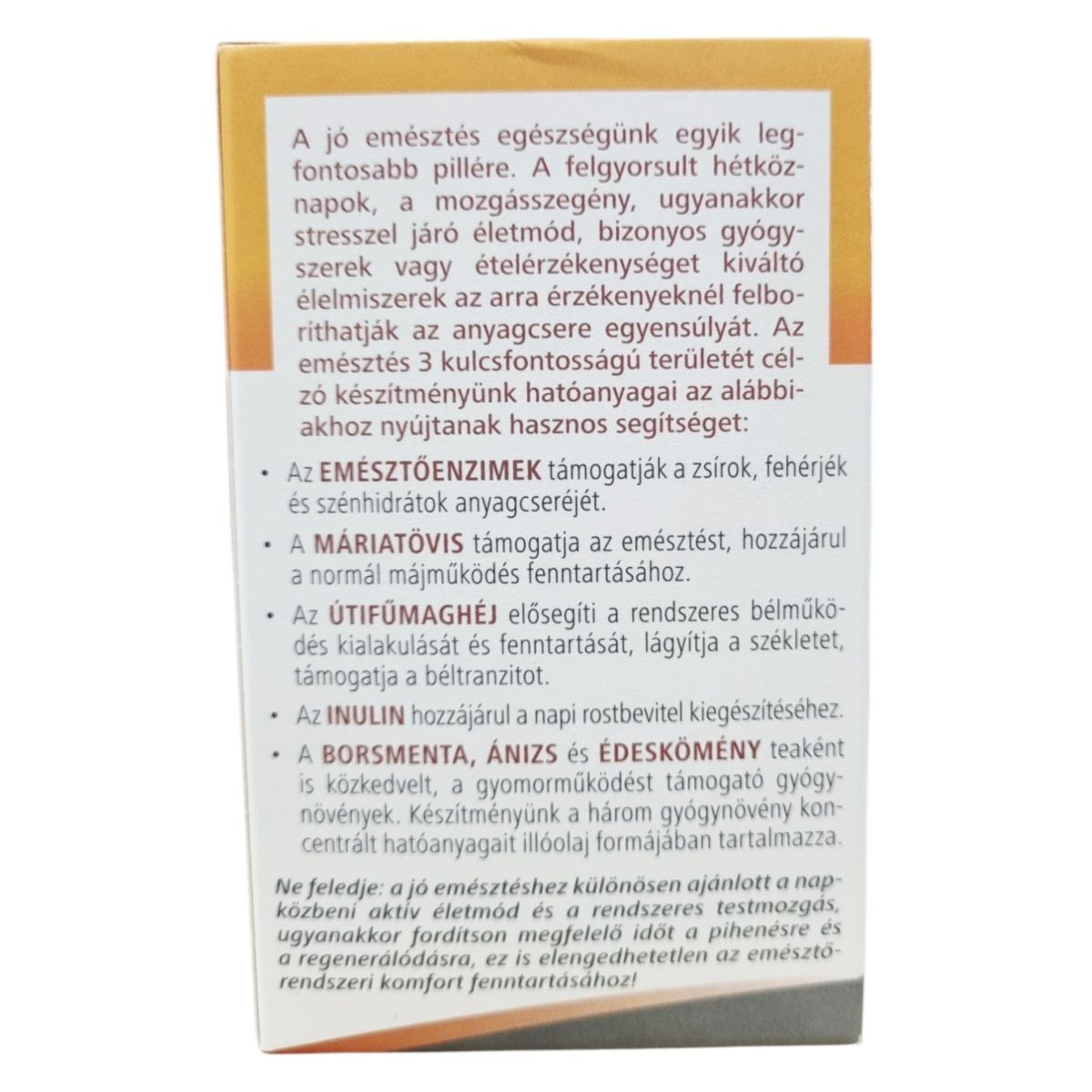 Zselatin; tömegnövelő szer: mikrokristályos cellulóz; útifű (Plantago ovata) maghéj őrlemény; Máriatövis (Silybum marianum) terméskivonat; csomósodást gátló anyagok: kalcium-hidrogén-foszfát, talkum, szilícium-dioxid, sztearinsav, maltodextrin; papain (Carica papaya gyümölcsből), alfa-amiláz (Aspergillus oryzae), bromelain (Ananas comosus gyümölcsből), laktáz (Aspergillus oryzae), celluláz (Trichoderma reesei), semleges proteáz (Bacillus licheniformis), lipáz (Aspergillus oryzae); borsmenta (Mentha x piperita) illóolaj; édeskömény (Foeniculum vulgare) illóolaj; ánizs (Pimpinella anisum) illóolaj.