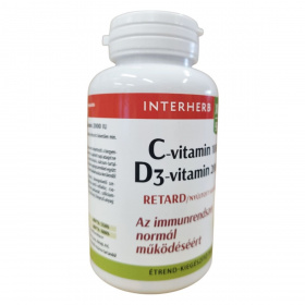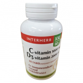 Az INTERHERB XXL étrend-kiegészítő tabletta nagydózisú C- és D3-vitamint tartalmaz, amelyek nyújtott kioldódású formulája hozzájárulhat a szervezet kiegyensúlyozott vitaminellátásához. A C-vitamin segíthet az immunrendszer normál működésében, a sejtek oxidatív stresszel szembeni védelmében, valamint a fáradtság csökkentésében. A D-vitamin támogathatja az egészséges csontozat és fogazat fenntartását, valamint a kalcium és foszfor hasznosulását. A termék fogyasztása nem helyettesíti a kiegyensúlyozott étrendet és az egészséges életmódot.