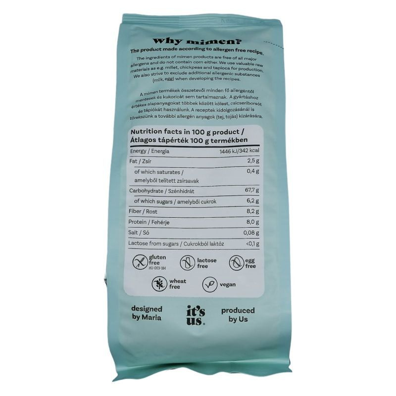 Az Its Us Mimen gluténmentes lisztkeverék egy kiváló választás mindazok számára, akik szeretnék élvezni a friss, házi készítésű pékárukat anélkül, hogy a glutén okozta problémákkal kellene szembenézniük. Ez a lisztkeverék kifejezetten kelt tésztákhoz és pékárukhoz lett kifejlesztve, így ideális alapanyagot biztosít a különféle péksütemények, pizzák és pogácsák elkészítéséhez. A lisztkeverék szójamentes és vegán, így széles körben alkalmazható, különösen azok számára, akik étkezési korlátozásokkal élnek. Az Its Us Mimen lisztkeverék használatával könnyedén készíthetünk ízletes és tápláló ételeket, amelyek nemcsak finomak, hanem egészséges alternatívát is jelentenek a hagyományos búzalisztből készült termékekkel szemben.