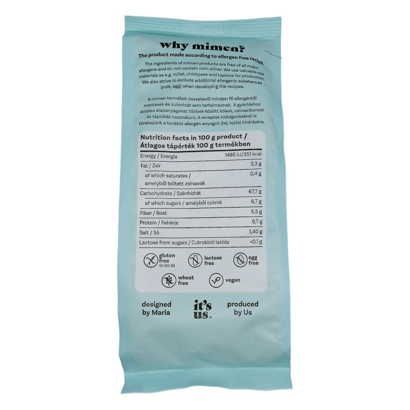 Összetevők: kölesliszt, tápiókakeményítő, csicseriborsóliszt, dextróz, útifű maghéj rost (psyllium rost), étkezési só, térfogatnövelő szer (nátrium-karbonátok), stabilizátor (xantángumi).