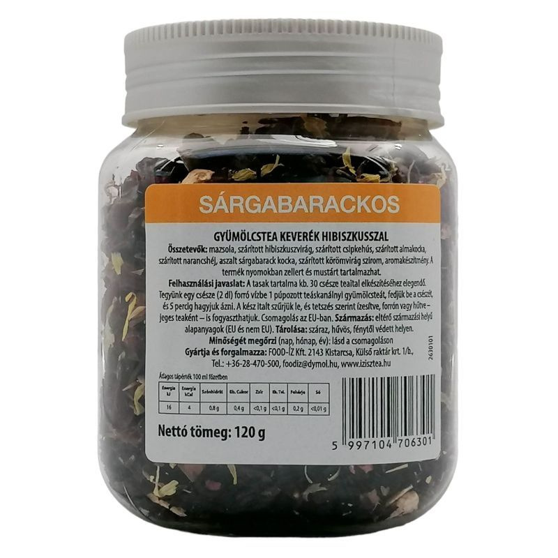 Mazsola, szárított hibiszkuszvirág, szárított csipkehús, szárított almakocka, szárított narancshéj, aszalt sárgabarack kocka, szárított körömvirág szirom, aromakészítmény. A termék nyomokban zellert és mustárt tartalmazhat. Felhasználási javaslat: A tasak tartalma kb. 30 csésze teaital elkészítéséhez elegendő. Tegyünk egy csésze (2 dl) forró vízbe 1 púpozott teáskanálnyi gyümölcsteát, fedjük be a csészét, és 5 percig hagyjuk ázni. A kész italt szűrjük le, és tetszés szerint ízesítve, forrón vagy hűtve - jeges teaként - is fogyaszthatjuk.Tárolása:száraz,hűvös,fénytől védett helyen.