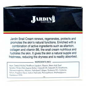 A Jardin Naturel Csigakrém könnyen felszívódó készítmény, amely összetett hatóanyag-kombinációjának köszönhetően táplálja, hidratálja és visszaadja a bőr természetes rugalmasságát és feszességét. A csiganyálka kivonat aktívan segíti a bőrsejtek megújulását és az apróbb bőrhibák regenerálását. A krémben található allantoin, kollagén és B6-vitamin együttesen támogatja a bőr természetes védelmét és egészséges megjelenését.