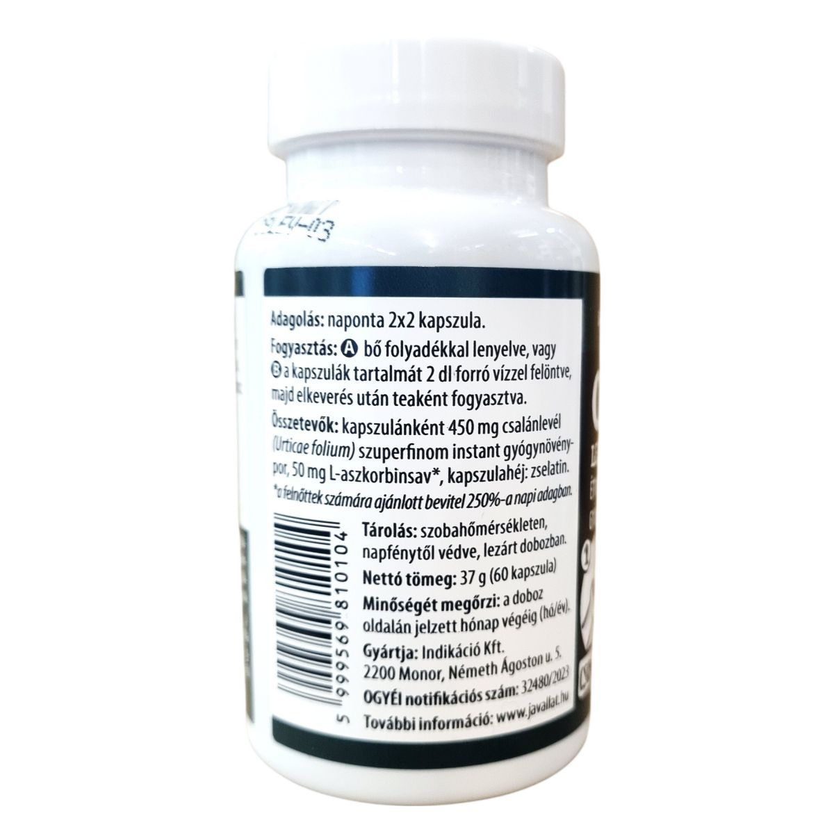 A C-vitamin hozzájárulhat a normál kollagénképződéshez, amely révén támogathatja a csontozat, porcok, fogíny, fogak és a bőr egészséges állapotát. Továbbá az immunrendszer egészséges működését is segítheti. A csalán levele támogatja a szív- és érrendszer egészségét és hozzájárulhat az immunrendszer normál működéséhez. A kapszulák fogyasztása bő folyadékkal javasolt, vagy a kapszula tartalma elkészíthető teaként is az útmutatás szerint. A termék kapszulánként 450 mg csalánlevél szuperfinom instant gyógynövényport és 50 mg L-aszkorbinsavat tartalmaz, amely a felnőttek számára ajánlott napi C-vitamin bevitel 250%-át jelenti.