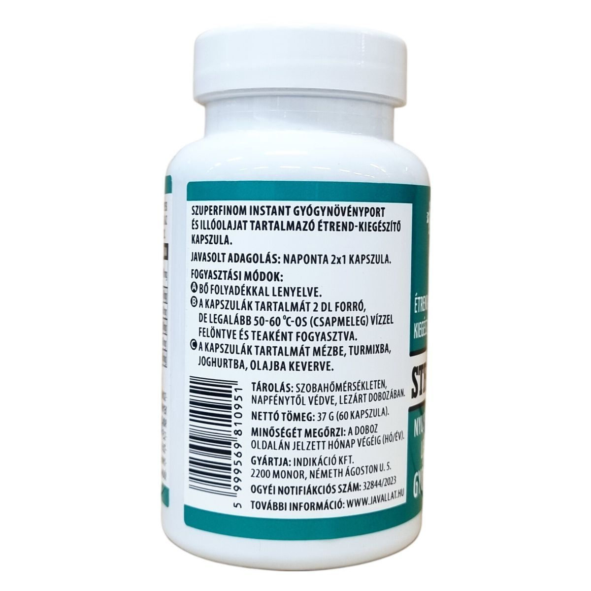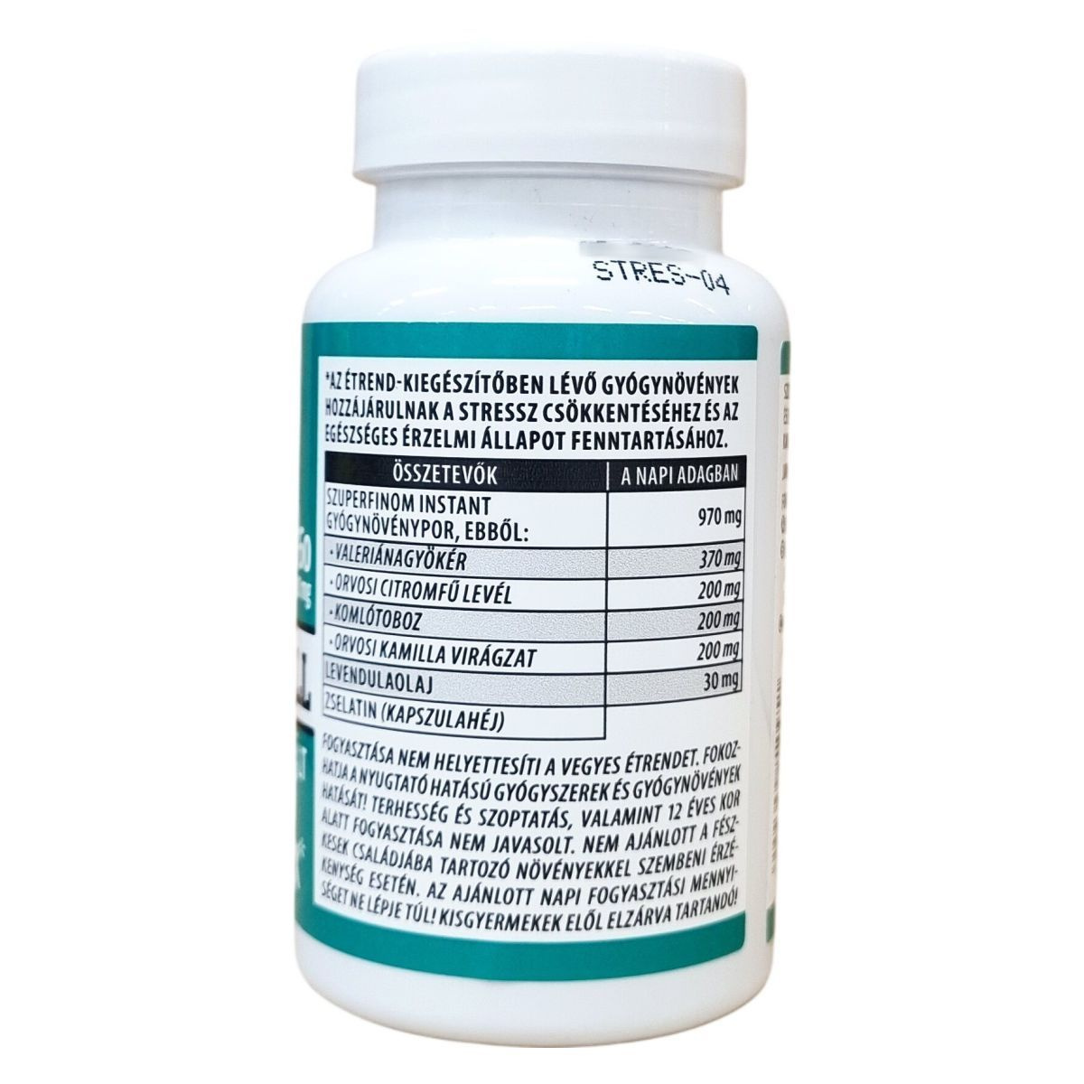 A Javallat™ Stressz Kontroll egy étrend-kiegészítő, amely szuperfinom instant gyógynövényport és illóolajat tartalmazó kapszulák formájában készül. Összetevői között található valerianagyökér, orvosi citromfű levél, komlótoboz, orvosi kamilla virágzat és levendulaolaj. Ezek a gyógynövények hozzájárulhatnak a stressz csökkentéséhez és az egészséges érzelmi állapot fenntartásához. A kapszula zselatinból készült héjból áll. Az ajánlott napi adag 2 kapszula, amelyet fogyaszthatunk bő folyadékkal, teaként felöntve vagy ételekhez keverve. A termék fogyasztása nem helyettesíti a változatos étrendet, és nem javasolt terhesség, szoptatás idején, valamint gyermekeknek 12 éves kor alatt. A termék kisgyermekektől elzárva tartandó.