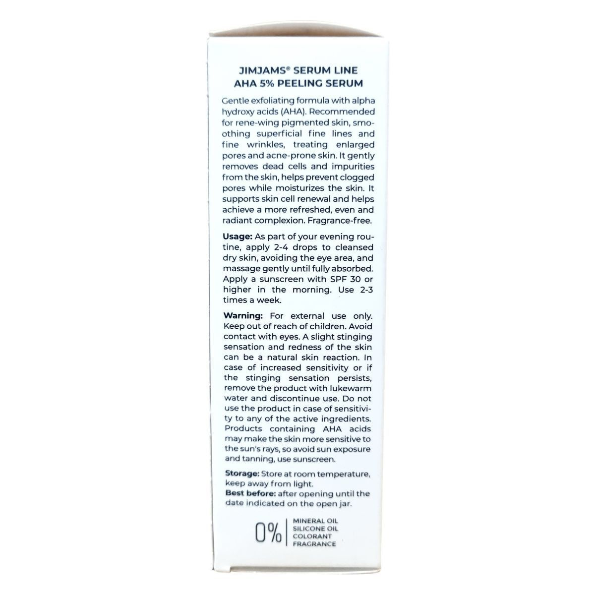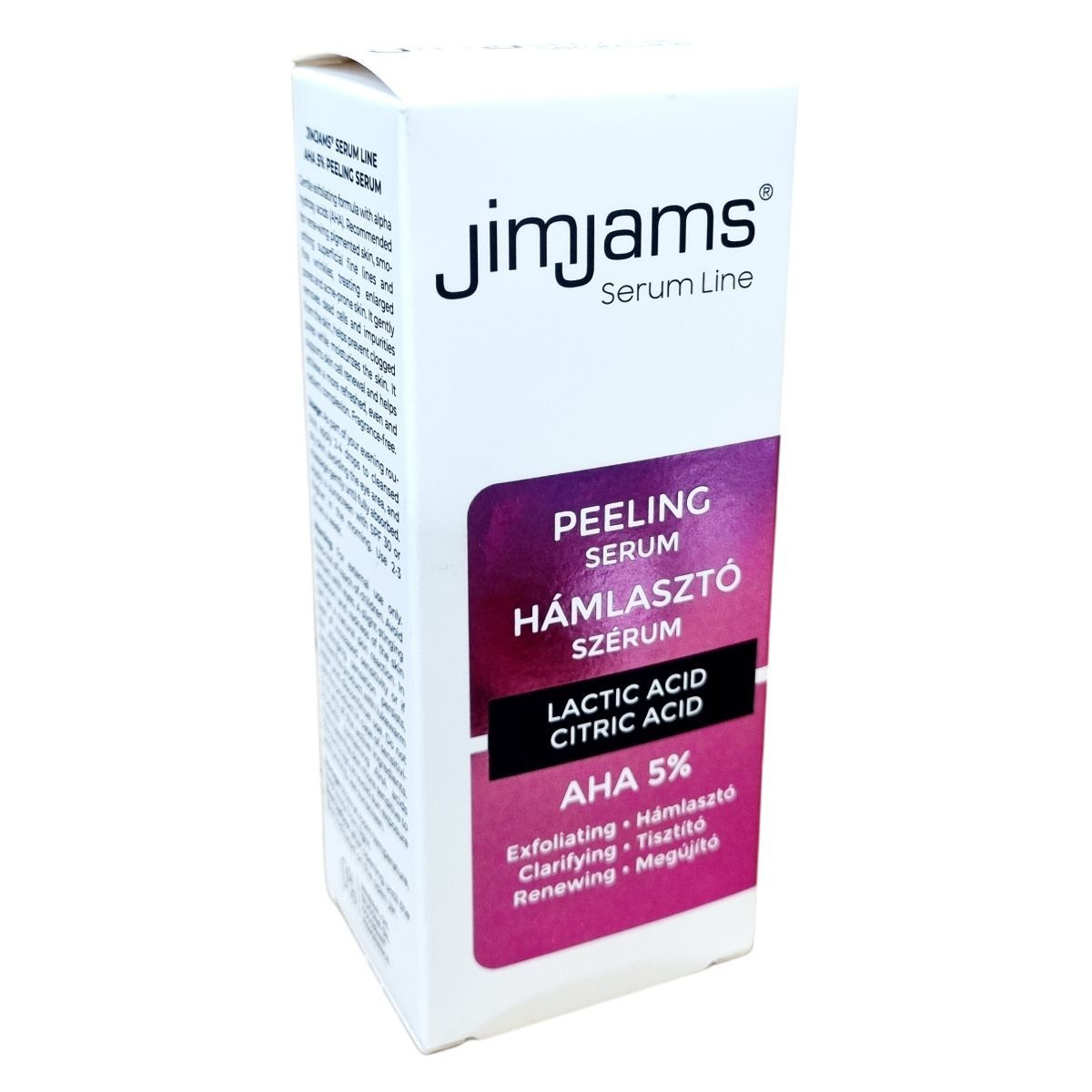 A jimjams® Serum Line AHA 5% hámlasztó szérum gyengéden távolítja el az elhalt hámsejteket és a szennyeződéseket, megakadályozva a pórusok eltömődését, miközben hidratálja a bőrt. Kifejezetten ajánlott pigmentfoltos bőr megújítására, a finom ráncok és tág pórusok kezelésére, valamint pattanásos bőr ápolására. Illatanyagmentes összetétele biztosítja a kíméletes ápolást. A termék az AHA-savaknak köszönhetően támogatja a bőrsejtek megújulását, így segít elérni az üde, egyenletes és ragyogó arcbőrt.