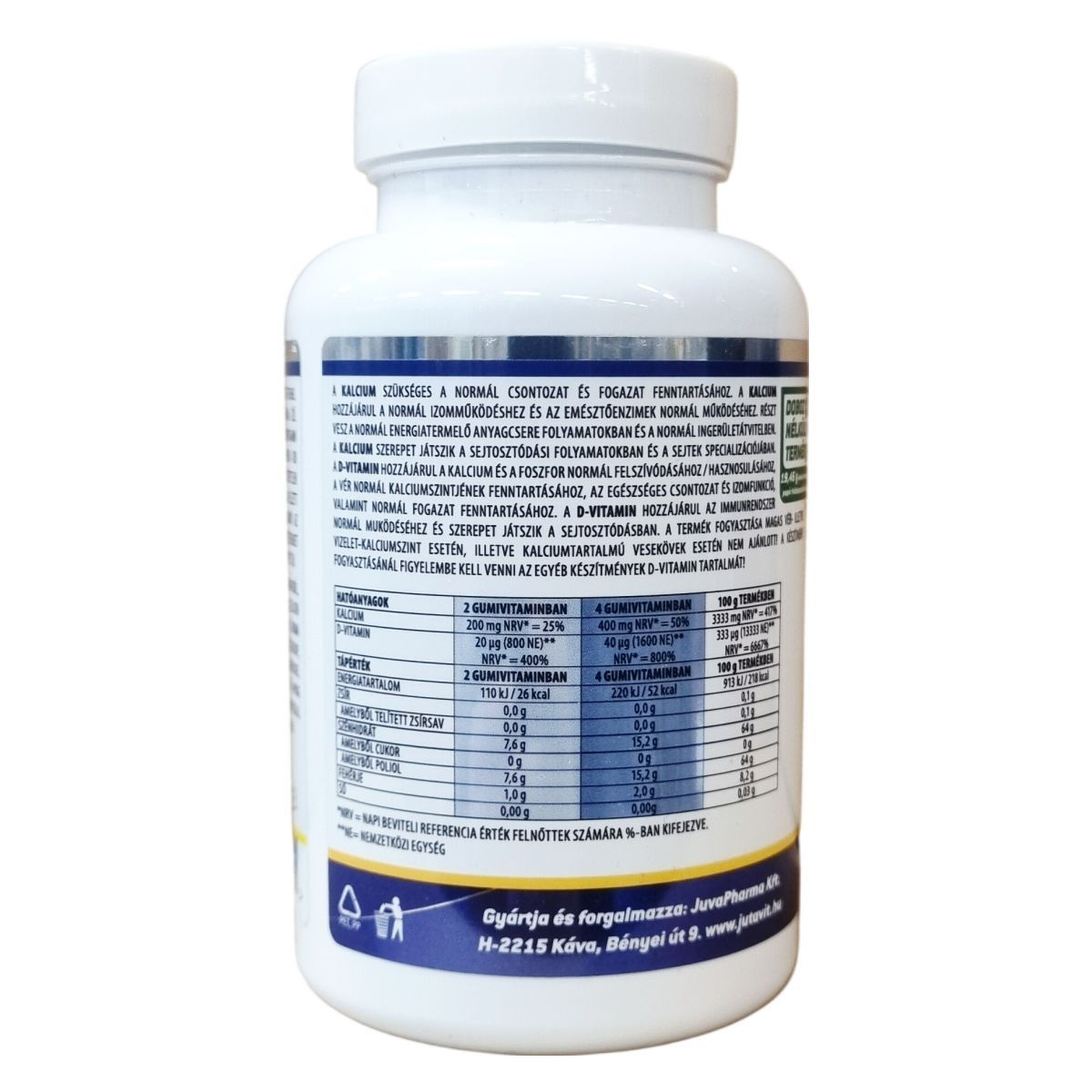 A JutaVit Kalcium + D3 gumivitamin édesítőszerrel készült, málna ízű, cukormentes termék, amely mesterséges színezéket és aromát nem tartalmaz. A fő hatóanyagok a kalcium és a D3-vitamin, amelyeket kalcium-citrát formájában és kolekalciferol néven találhatunk meg a készítményben. A termék zselatint is tartalmaz, mely marha eredetű. A gumivitamin stabilitását és minőségét számos adalékanyag biztosítja, mint például savanyúságot szabályozó anyagok, antioxidánsok és fényezőanyag. A termék a hivatalos notifikációs számmal rendelkezik, és gyermekeknek 3 éves kortól, illetve felnőtteknek ajánlott mennyiségben fogyasztható elszopogatva vagy elrágva. A készítményt célszerű szobahőmérsékleten, napfénytől védve tárolni, és gyermekek elől elzárva tartani. Fontos megjegyezni, hogy az étrend-kiegészítő nem helyettesíti a kiegyensúlyozott étrendet és az egészséges életmódot.