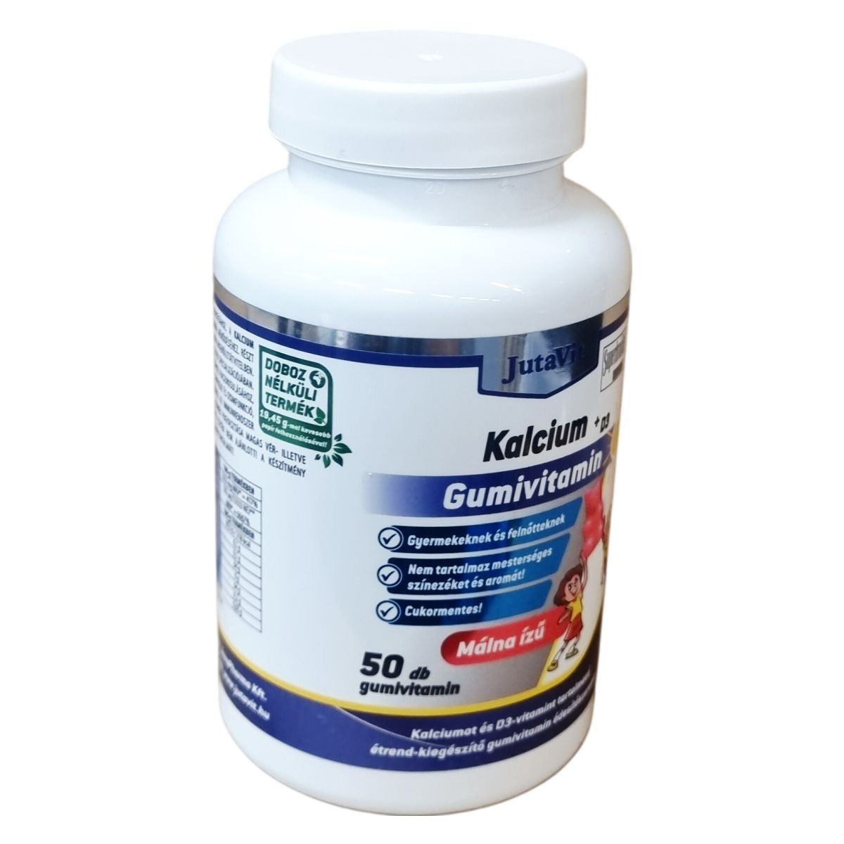 JutaVit Kalcium + D3 gumivitamin 50x Cukormentes. Gyermekeknek és felnőtteknek. Nem tartalmaz mesterséges színezéket és aromát! Málna ízű. Kalciumot és D3-vitamint tartalmazó étrend-kiegészítő gumivitamin édesítőszerekkel.