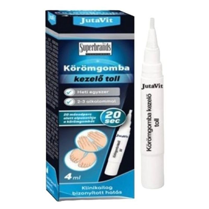 A JutaVit körömgomba kezelő toll egy orvostechnikai eszköz, amely segíthet a gombás köröm (onychomycosis) kezelésében. A folyadék réteget képez a körmön, így a gombák szaporodásának kedvezőtlen környezetet hozhat létre, és fizikai gátként akadályozhatja meg a penészgombák terjedését.