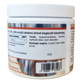 Mio-inozitol tartalmú étrend-kiegészítő készítmény. Az inozitol (B8-vitamin) egy vitaminszerű anyag, a B-komplex család nem esszenciális tagja – klasszikus értelemben nem sorolható a vitaminok közé, mivel szervezetünk elő tudja állítani. A természetben leginkább gyümölcsökben, babban, teljes kiőrlésű gabonafélékben és diófélékben fordul elő. Megtalálható a szervezetünk sejtmembránjaiban, legmagasabb koncentrációban az agyban és a központi idegrendszerben. A mio-inozitol nélkülözhetetlen a sejtek közötti kommunikációhoz, elengedhetetlen többféle agyi jelzőrendszer megfelelő működéséhez. Segít javítani a különböző receptorok (ingerfelfogó idegvégek) érzékenységét – emiatt nagyon fontos szerepet játszik a jelátviteli folyamatokban. Az inozitolnak összesen 9 különböző formája van, a két leggyakrabban használt és legtöbbet kutatott természetes forma a mio-inozitol és a d-kiro-inozitol. A termékünkben használt mio-inozitol az inozitol legstabilabb formája. Nettó tömeg: 200 g. 100 adag. Vonalkód: 5999887075438.
