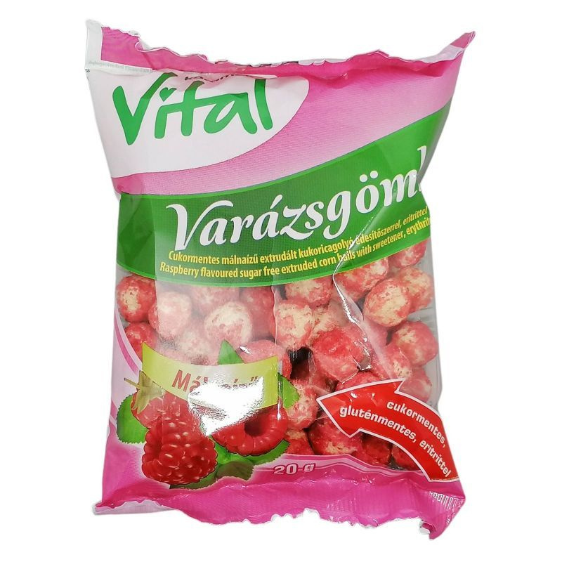 Vital Varázsgömb. Cukormentes málnaízű extrudált kukoricagolyó édesítőszerekkel. Gluténmentes. 20g, friss, ropogós, kellemes aromájú, gyümölcs íze dominál