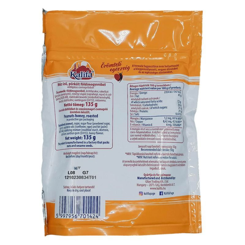 A földimogyoró remek magnézium, réz, foszfor, kálium és cinkforrás. Földimogyoró, kristálycukor, cukorliszt (porcukor, keményítő), növényi olajok (napraforgó, repce) és zsírok (pálma) RSPO-MB, stabilizáló keverék (módosított keményítő, dextróz,stabilizátor, xantálgumi (E415),mézaroma.