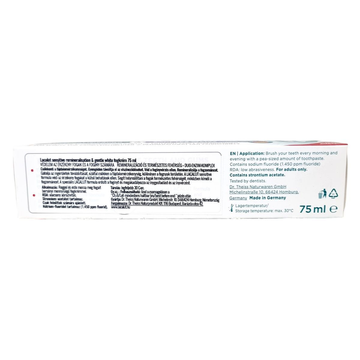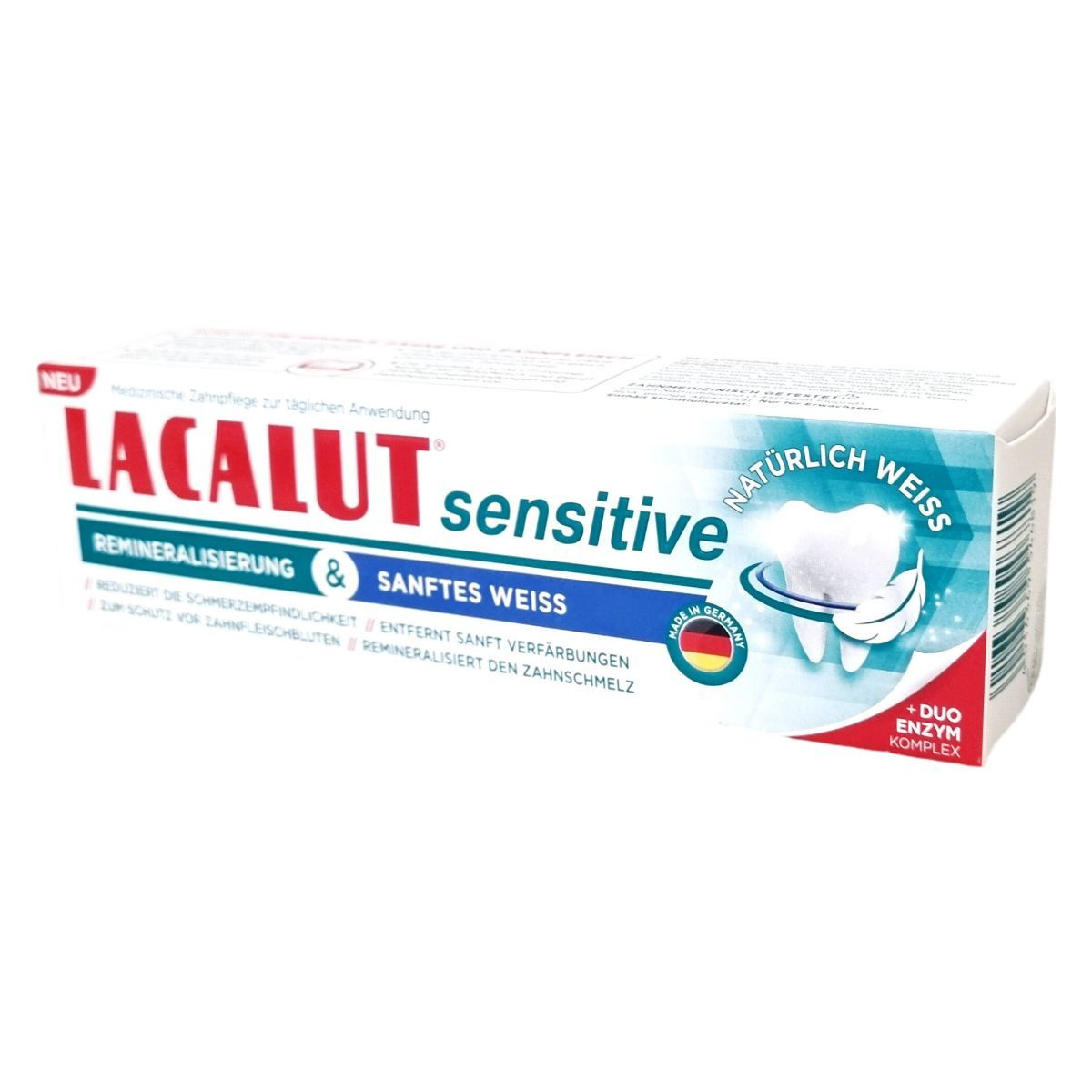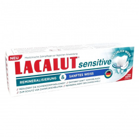 A Lacalut sensitive fogkrém orvosi célú napi fogápolásra készült, természetes fehérséget biztosít és gyengéden eltávolítja az elszíneződéseket. Hatékonyan csökkenti a fájdalomérzékenységet, különösen a fognyak területén, mivel gátolja az ingerületek továbbítását. A formula védi az érzékeny fogakat a külső behatások ellen, erősíti a fogínyt, valamint megelőzi az ínygyulladást és az ínyvérzést. Alacsony abrazivitású, így kíméletes a fogzománchoz, miközben remineralizálja azt és támogatja a fogíny egészségét. A termék DUO enzimeket tartalmaz, melyek hozzájárulnak a hatékonysághoz. Made in Germany, fogorvosok által tesztelt.