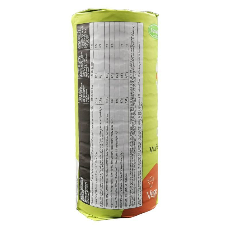 Ideális harapnivaló két étkezés között. Összetevők: kukoricaliszt 73%, burgonyakeményítő, rizsliszt, kukoricakeményítő, só, szódabikarbóna, kurkuma, kcal/100g:380 kcal,kj/100g:1611 kJ,Zsír:1,3g,ebből telített zsírsavak:0,2g,Szénhidrát:83,8g,ebből cukrok:1,8g,Rost:3,0gFehérje:6,7g,Só:0,97g,