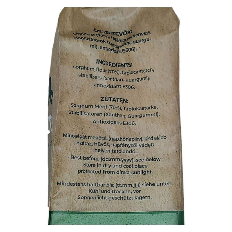 Összetevők: cirokliszt (70%), tápióka keményítő, stabilizátorok (xantángumi, guargumi).