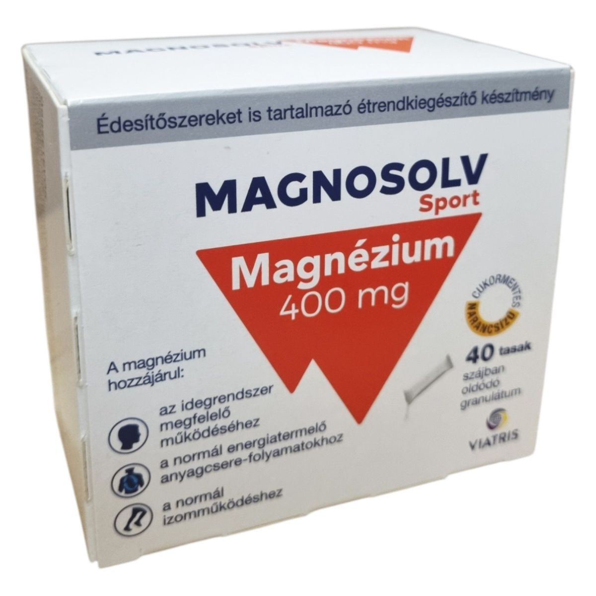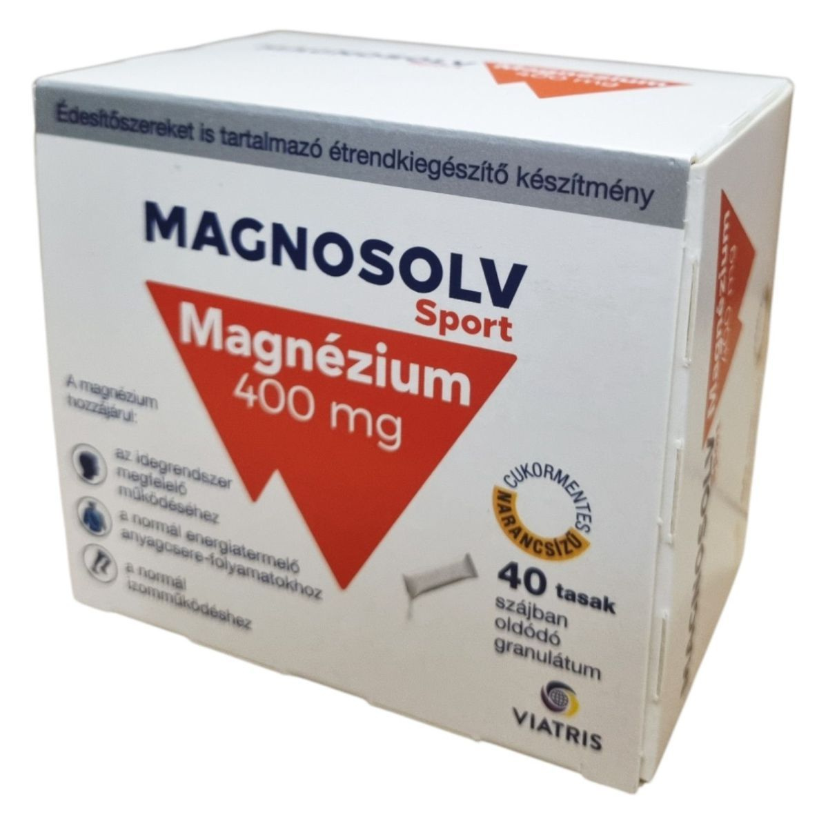 A MAGNOSOLV Sport egy kényelmesen alkalmazható, szájban oldódó granulátum formájú étrendkiegészítő, amely tasakonként 400 mg magnéziumot tartalmaz. A magnézium hozzájárulhat az idegrendszer, az energiatermelő anyagcsere-folyamatok és az izmok normális működéséhez. A termék cukormentes, narancsízű, és édesítőszereket tartalmaz. A granulátum közvetlenül a nyelvre öntve, víz nélkül is bevehető, így ideális választás lehet azok számára, akik gyors és egyszerű megoldást keresnek a magnéziumbevitelre. Az étrendkiegészítők nem helyettesítik a változatos, kiegyensúlyozott táplálkozást és az egészséges életmódot.