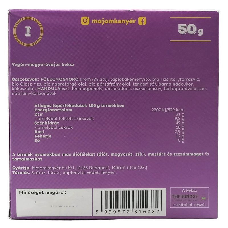 Összetevők: FÖLDIMOGYORÓ krém (37,8%), tápiókakeményítő, bio rizsital /forrásvíz, bio olasz rizs , bio napraforgó olaj, bio pórsáfrány olaj, tengeri só/, kókuszvirág cukor, kókusz olaj, MANDULAliszt, lenmagpehely, édesítőszer eritrit, antioxidáns: aszkorbinsav, térfogatnövelő szer: nátrium-karbonátok.