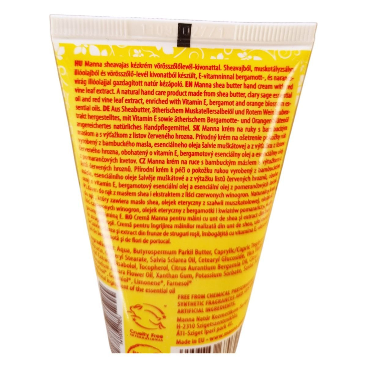 A Manna sheavajas kézkrém vörösszőlőlevél-kivonattal készült, E-vitaminnal, bergamott- és narancsvirág illóolajjal gazdagított natúr kézápoló.