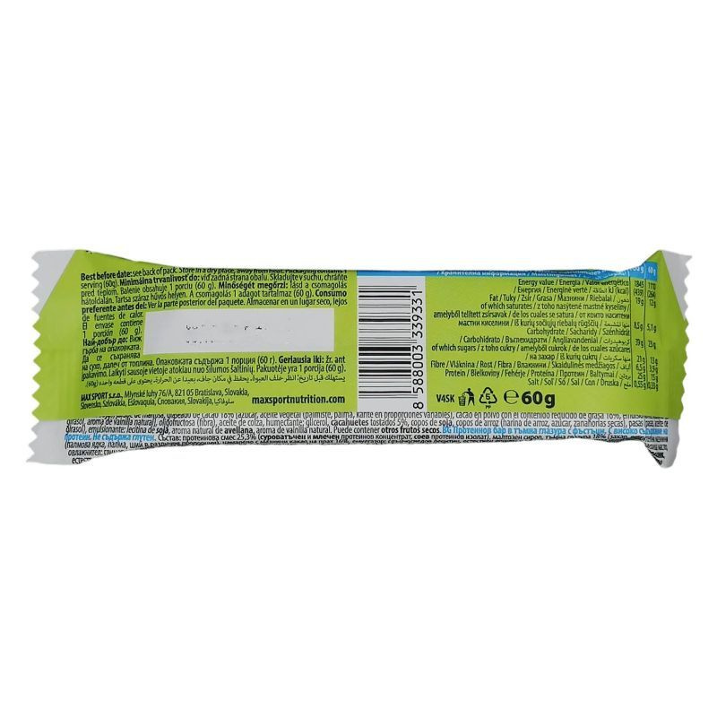 Összetevők: A fehérjék keveréke 25,6% (10,1% -os koncentrátum és a tej 2,7% fehérjék és a szójafehérje izolátuma 12,8%), maltózszirup, sötét kakaó bevonat (cukor, teljesen és részben hidrogénezett zöldség Zsír /pálmamag /, zsír-redukált kakaópor 10%, emulgeálószerek: napraforgó lecitin, poliglicerolpolyricinoleate, aroma, ételfesték: növényi szén fekete), oligofruktóz (oldódó rost), repeszes olaj, humektáns: glicerin, séhlakok, raisinok (Raisins (Raisins) , Napraforgóolaj), rizs ropogása (rizsliszt, cukor, szárított sárgarépa), zsír-redukált kakaópor 2%, emulgeálószer: szója lecitin, aroma. Tartalmazhat földimogyorót és más dióféléket.