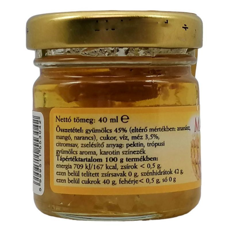 Összetevők: gyümölcs 45% (eltérő mértékben: ananász, mangó, narancs), cukor, víz, méz 3,5%, citromsav, zselésítő anyag: pektin, trópusi gyümölcs aroma, karotin színezék.
