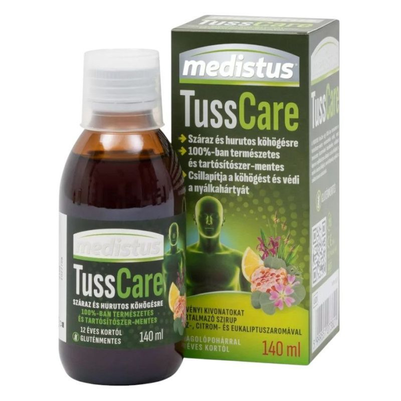 A Medistus Tusscare egy 100%-ban természetes és tartósítószer-mentes orvostechnikai eszköz, amely természetes összetevőinek köszönhetően, védőfilmet képezve a nyálkahártyán csillapítja a száraz köhögést, és enyhíti a hurutos köhögést, mivel elfolyósítja a nyálkát és csökkenti annak viszkozitását.