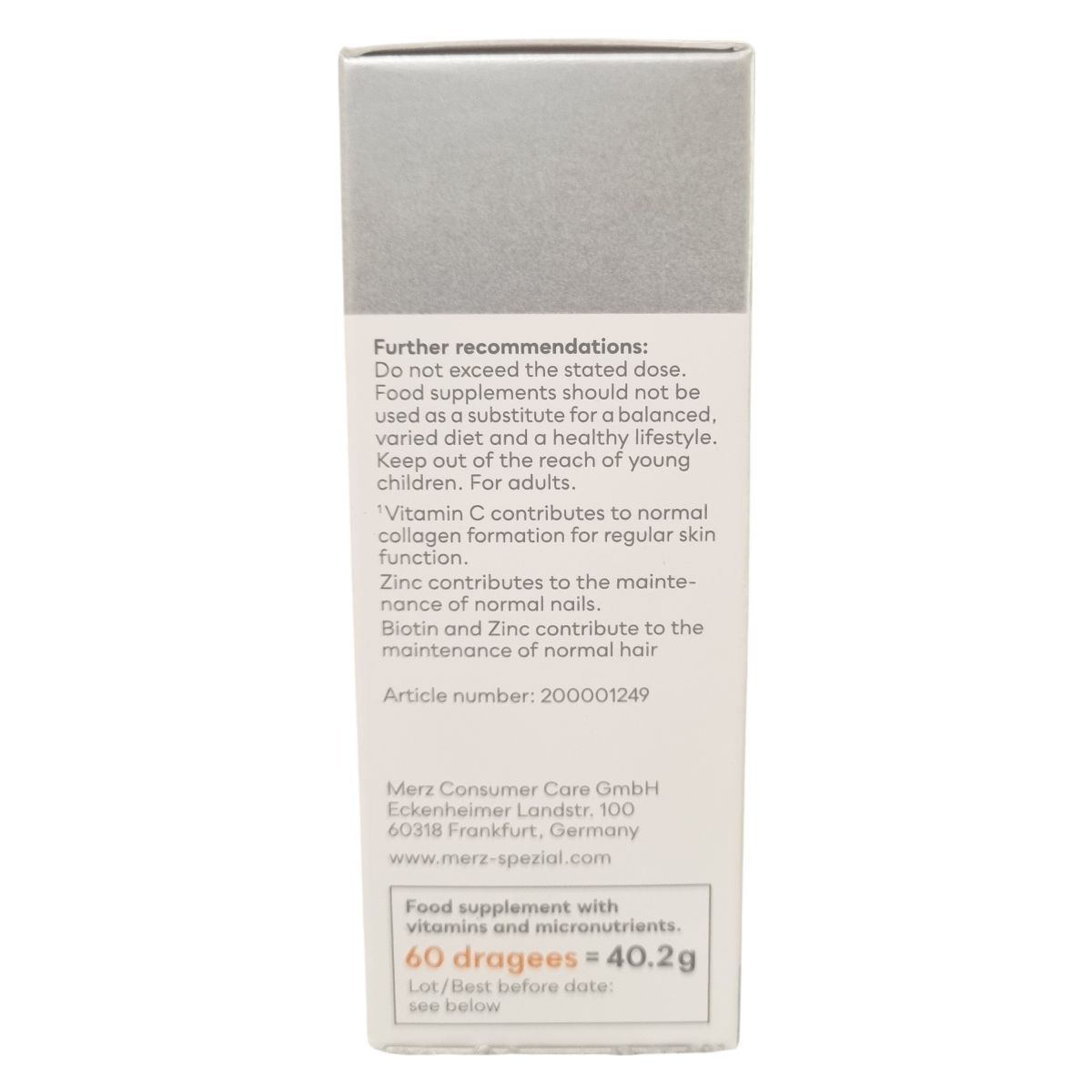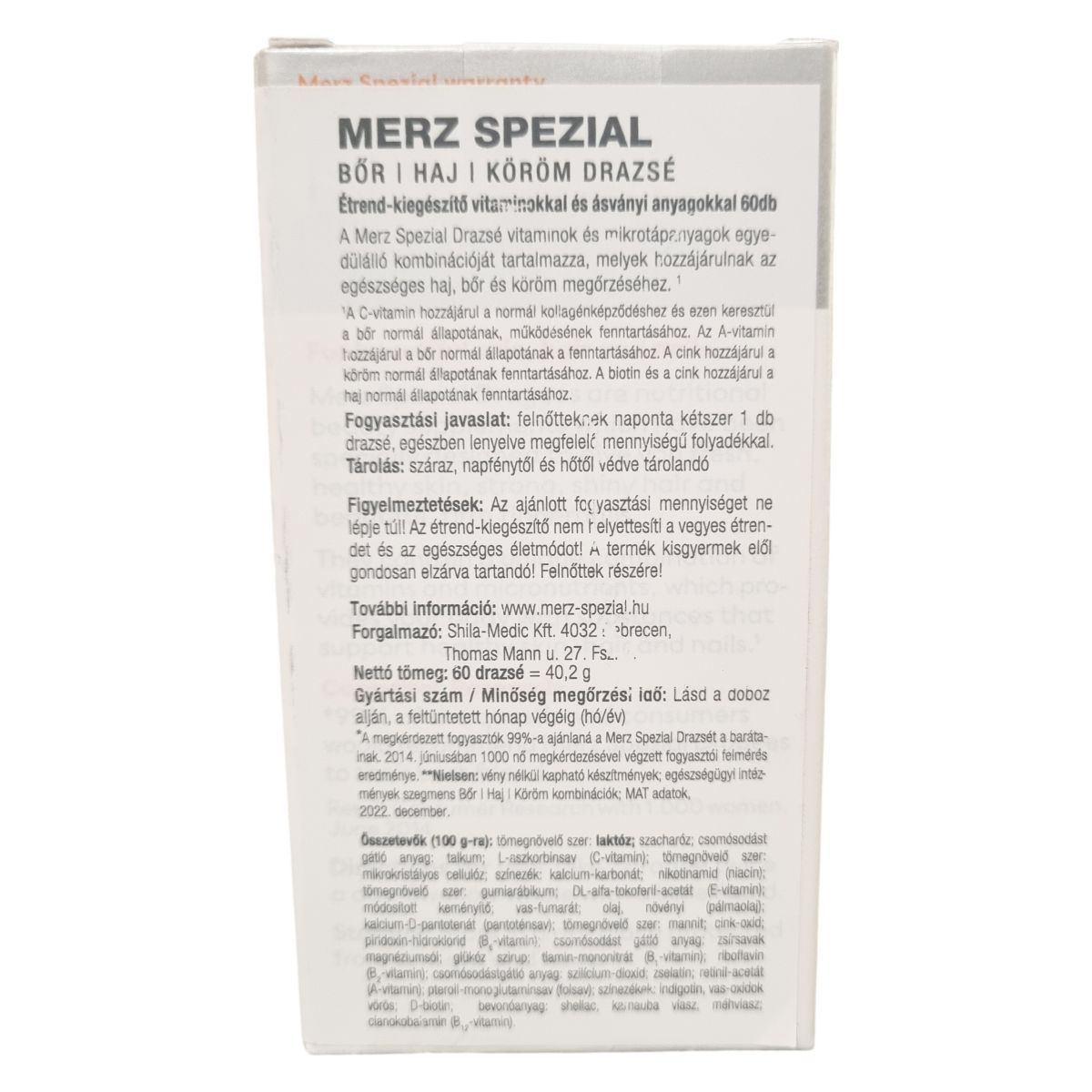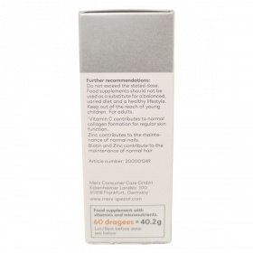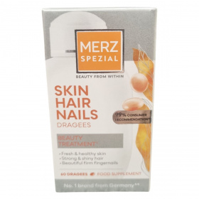 A Merz Spezial Drazsé vitaminok és mikrotápanyagok egyedülálló kombinációját tartalmazza, amelyek hozzájárulhatnak az egészséges haj, bőr és köröm megőrzéséhez. A C-vitamin hozzájárul a normál kollagénképződéshez és ezáltal a bőr normál állapotának fenntartásához. Az A-vitamin szintén támogatja a bőr megfelelő működését. A cink hozzájárulhat a köröm normál állapotának fenntartásához, míg a biotin és cink együttesen támogathatják a haj egészségét. A termék 99%-os fogyasztói ajánlással rendelkezik, amely egy 2014-es, 1000 nő bevonásával végzett felmérés eredménye. A Merz Spezial a német piac egyik vezető márkája ezen a területen. A drazsé készítmény elősegítheti a friss és egészséges bőr, erős és fényes haj, valamint szép, feszes körmök fenntartását, amit napi rendszerességgel, ajánlott adagban fogyasztva érhetünk el.