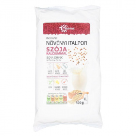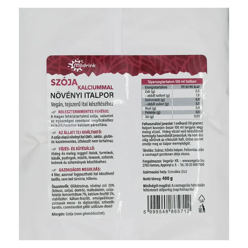 400 g porból akár 4 l italt is készíthet, ezzel csökkentve a hulladékképződést, így a MILDRINK szója italport környezetbarát terméknek tekinthetjük. Felhasználás: Termékünkkel kiválthatja étrendjében az állati eredetű tejet. Használható reggeli italok elkészítéséhez, gabonapelyhek, müzlikeverékek fogyasztásához, de szélesközűen alkalmazható a sütés-főzés minden területén (pl.: kásák, sütemények, levesek, főzelékek, krémek és pudingok készítésénél). Elkészítése: Keverjen legalább 10g (1 evőkanál vagy 3 kávéskanál) italport 100ml meleg vagy langyos vízhez (hideg ital készítésénél használjon turmixgépet). Ha nem érzi elég tejesnek az elkészült italt, ízlés szerint emelje a keverékben az italpor arányát. Tárolás: Maximum 25 °C-on 70% relatív nedvességtartalom mellett. Felbontás után gondosan zárja vissza a csomagot, ezzel megakadályozhatja a termék csomósodását. Összetevők: glükózszirup, növényi zsír 20% (kókusz, szója), dextróz, maltodextrin, szójafehérje koncentrátum 7%, kálcium-foszfát 3 %, stabilizátor: kálium-foszfát (E340), emulgeálószer: zsírsavak mono- és digliceridjei (E471), színezék: karotin, csomósodást gátló: szilícium-dioxid.