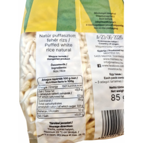 Gluténmentes, natúr puffasztott fehér rizs, amely könnyű, ropogós és természetes nassolnivalóként vagy ételek kiegészítőjeként fogyasztható.