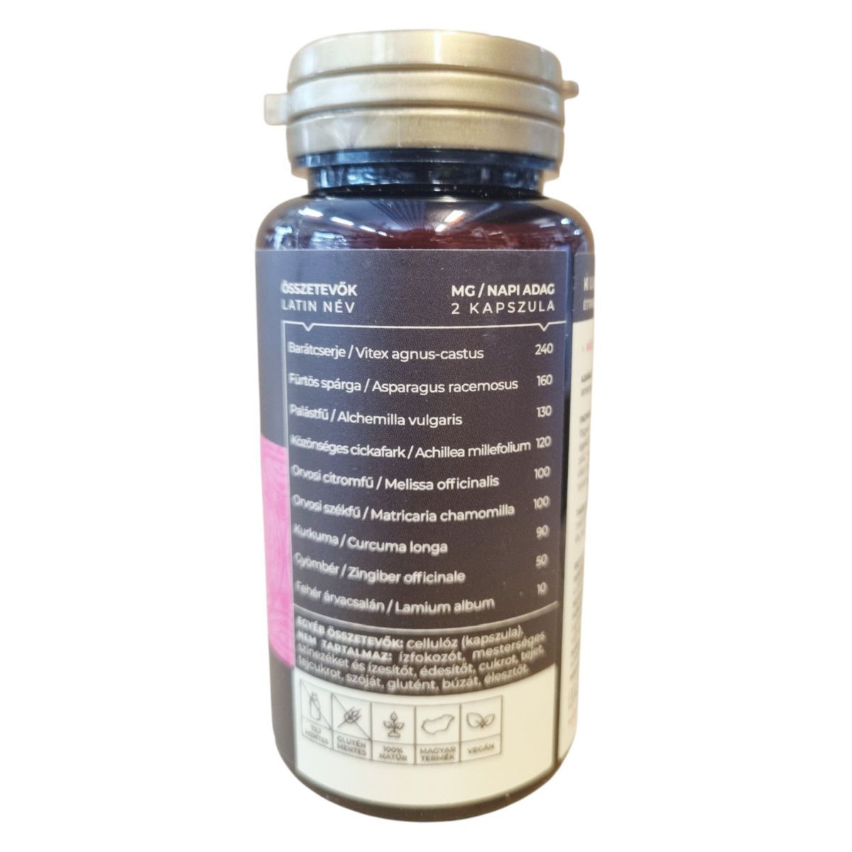 Barátcserje (Vitex agnus-castus) 240 mg, Fürtös spárga (Asparagus racemosus) 160 mg, Palástfű (Alchemilla vulgaris) 130 mg, Közönséges cickafark (Achillea millefolium) 120 mg, Kurkuma (Curcuma longa) 90 mg, Gyömbér (Zingiber officinale) 50 mg, Orvosi citromfű (Melissa officinalis) 10 mg, Orvosi székfű (Matricaria chamomilla) 10 mg, Fehér árvacsalán (Lamium album) 10 mg.