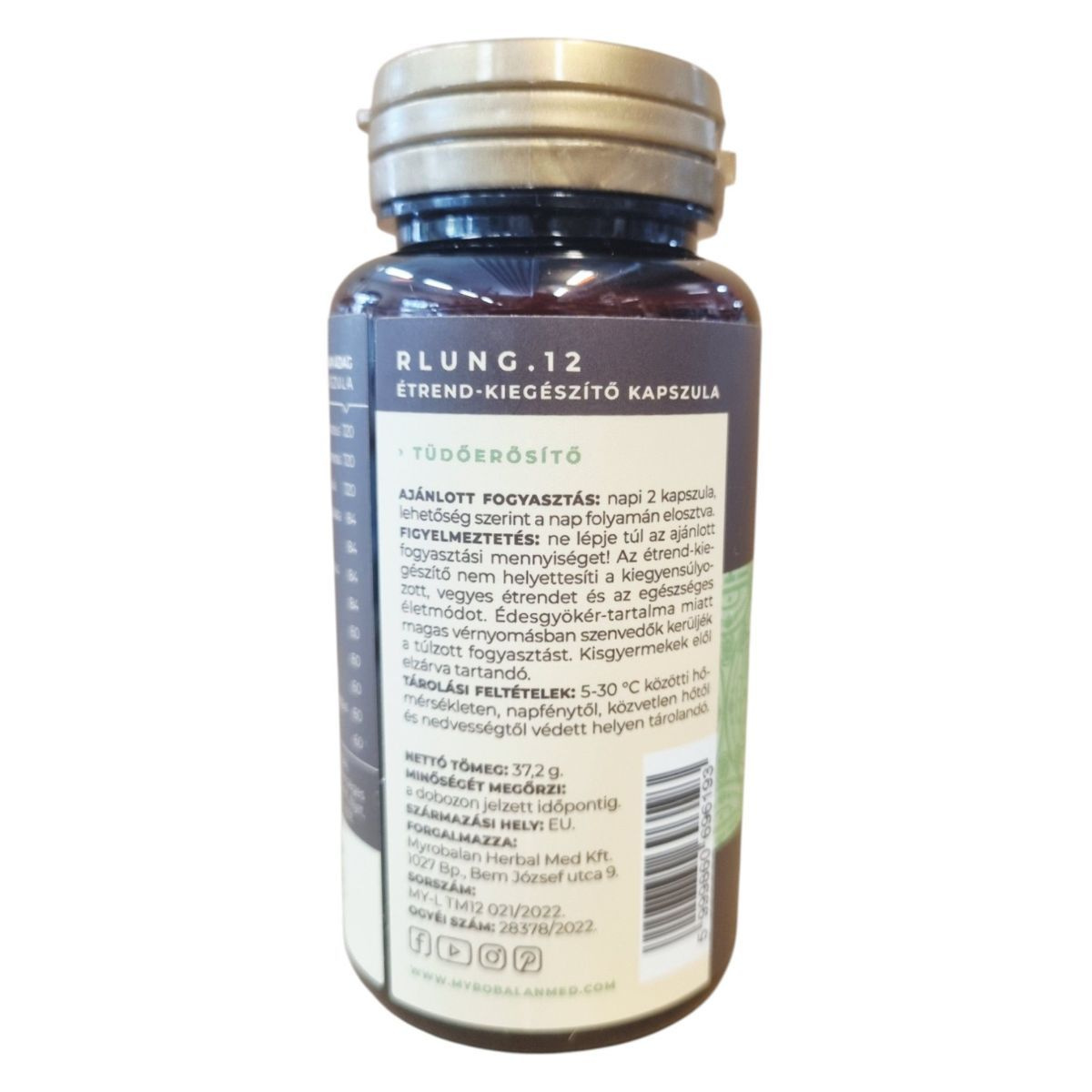 A MYROBALAN rLung.12 étrend-kiegészítő gyógynövény-komplex célja, hogy támogassa a tüdő egészségét különféle gyógynövények segítségével. A termék vegán és gluténmentes, nem tartalmaz mesterséges adalékanyagokat. A kapszulákban található gyógynövények, mint például a kínai csüdfű és a kínai kúszómagnólia, hozzájárulhatnak a légzőrendszer megfelelő működéséhez. Az édesgyökér-tartalom miatt magas vérnyomásban szenvedőknek ajánlott a mértékletes fogyasztás. A termék forgalmazója a Myrobalan Herbal Med Kft., és az OGYÉI engedélyszáma 28378/2022.