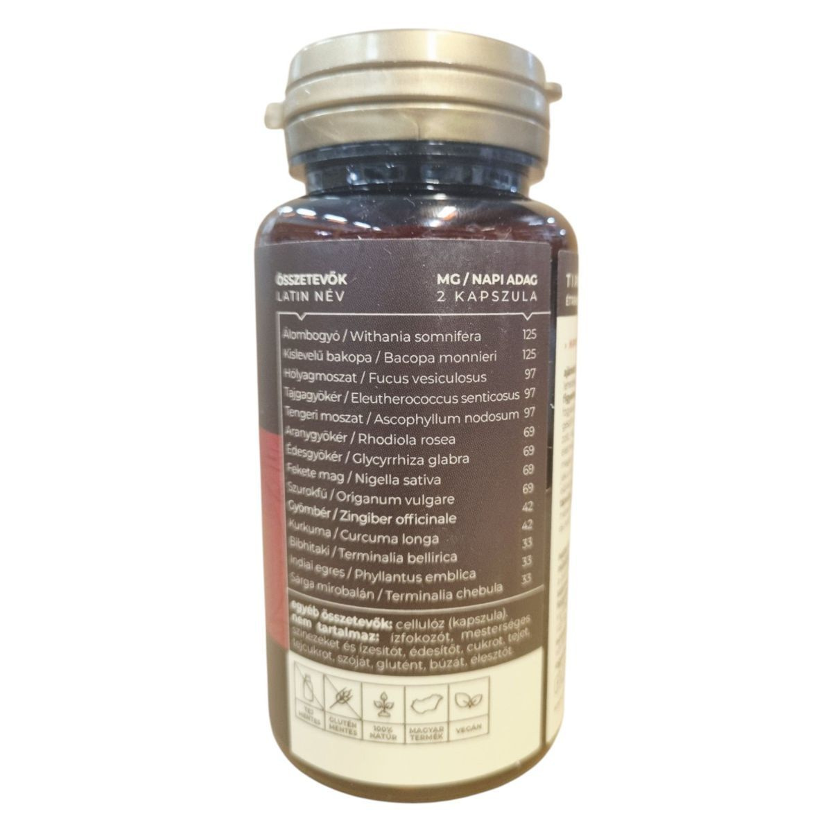 Álombogyó (Withania somnifera) 125 mg, Kislevelű bakopa (Bacopa monnieri) 97 mg, Hólyagmoszat (Fucus vesiculosus) 97 mg, Tajgagyökér (Eleutherococcus senticosus) 97 mg, Tengeri moszat (Ascophyllum nodosum) 97 mg, Aranygyökér (Rhodiola rosea) 69 mg, Édesgyökér (Glycyrrhiza glabra) 69 mg, Fekete mag (Nigella sativa) 69 mg, Szurokfű (Origanum vulgare) 42 mg, Gyömbér (Zingiber officinale) 42 mg, Kurkuma (Curcuma longa) 33 mg, Bibhitaki (Terminalia bellirica) 33 mg, Indiai egres (Phyllantus emblica) 33 mg, Sárga mirabolán (Terminalia chebula) 33 mg