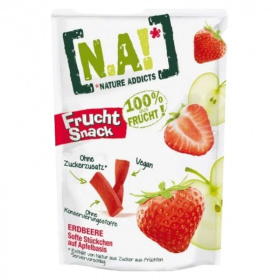 N.A! Gyümölcsrudacskák sűrített gyümölcspüréből és sűrített gyümölcsléből, 100%-ban gyümölcsből, hozzáadott cukor, tartósítószer és színezék nélkül. 100g termék 686g alma és 44g eper felhasználásával készült. Jó választás munkahelyre, iskolába, sportoláshoz.