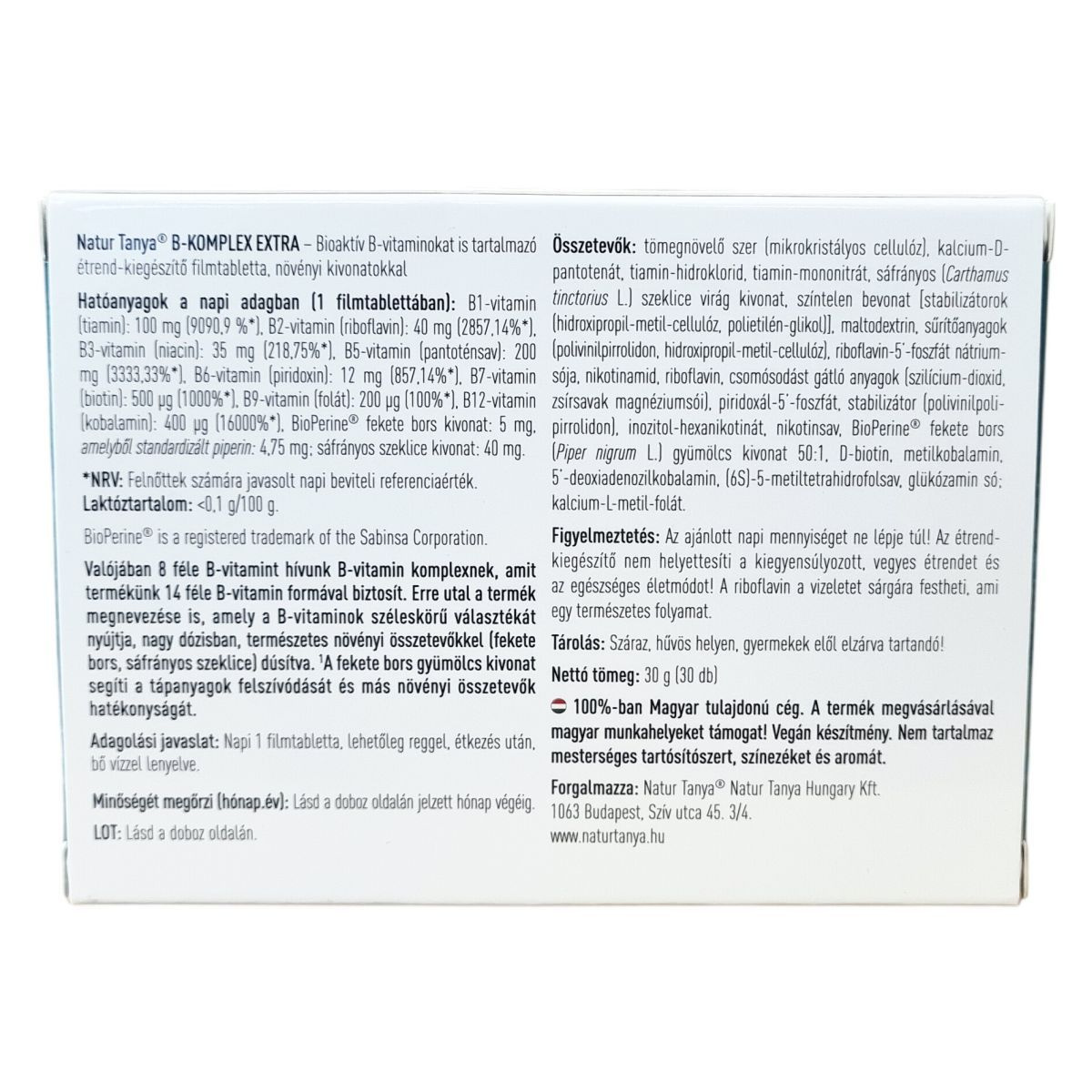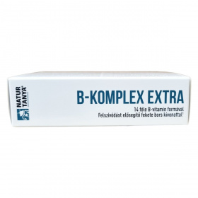 A Natur Tanya® B-Komplex Extra egy étrend-kiegészítő, amely a hagyományos 8 B-vitamin komplex helyett 14 féle B-vitamin formát és természetes növényi kivonatokat, például fekete bors és sáfrányos szeklice kivonatot tartalmaz. A fekete bors kivonat a BioPerine® név alatt világszabadalmi védelem alatt áll, amely segítheti a hatóanyagok felszívódását és hatékonyságát. A termék szigorú minőségi követelmények szerint készül, nem tartalmaz mesterséges tartósítószert, színezéket vagy aromát, valamint vegán és laktózmentes. Felnőttek számára kialakított adagolásával hozzájárulhat a szervezet b-vitamin szükségletének kielégítéséhez és támogatásához.