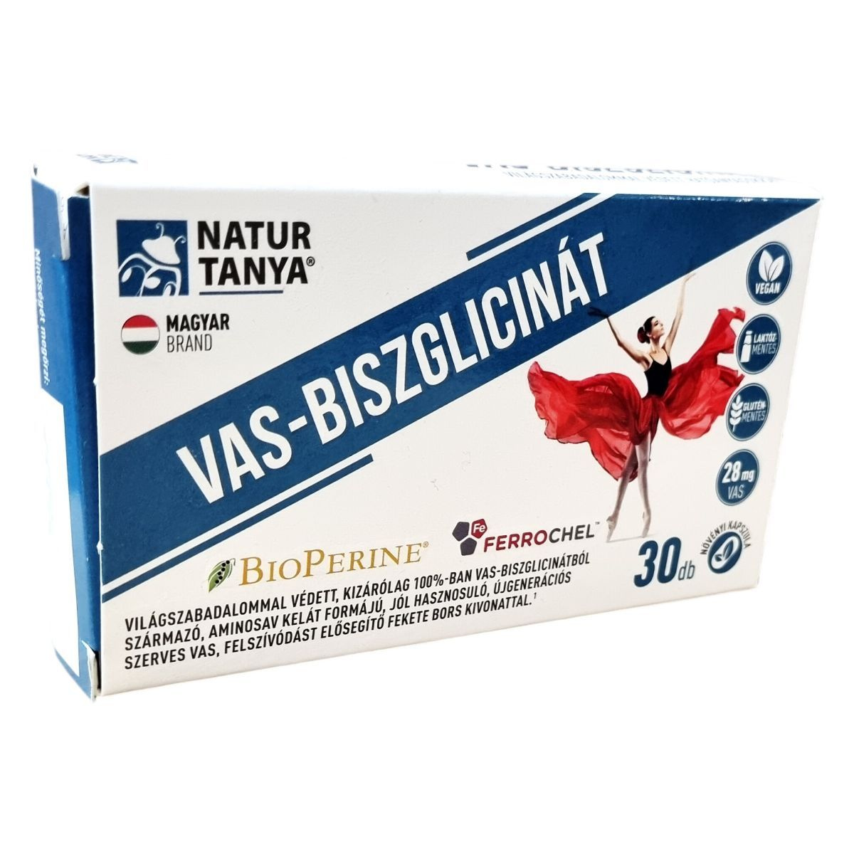A Natur Tanya® Vas-Biszglicinát termék világszabadalommal védett Albion™ Ferrochel™ vas-biszglicinátot és BioPerine® fekete bors kivonatot tartalmaz koncentrált növényi kapszulahéjban, összesen 8 szabadalom kapcsolódik az alkalmazott hatóanyagokhoz. A vas-biszglicinát aminósav kelát formában van jelen, amely jó felszívódást segíthet elő. A termék nem tartalmaz mesterséges színezéket, tartósítószert és aromát, valamint glutén- és laktózmentes. A vas hozzájárulhat a fáradtság csökkentéséhez, a normál szellemi működés fenntartásához, az immunrendszer egészséges működéséhez, továbbá támogathatja a normál vörösvérsejt- és hemoglobin képződést, részt vehet az energiatermelő anyagcsere-folyamatokban és az oxigénszállításban, valamint szerepet játszhat a sejtosztódásban. A fekete bors kivonat segítheti a tápanyagok felszívódását, így a vasét is. A termék vegán kapszulában készül, és kizárólag Magyarországon székhellyel rendelkező cég forgalmazza, vásárlásával magyar munkahelyek támogathatók.