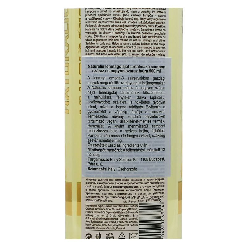 A Naturalis sampon száraz és nagyon száraz hajra lenmagol tartalmának köszönhetően a hajhullásra, fénytelen, durva tapintású, elvékonyodott szálakra is tökéletes gyógyírt jelent, mivel a benne található E-vitamin a gyökerüktől a végükig táplálja a tincseket. Természetes növényi eredetű összetevőket tartalmazó vegán, állatkísérlet-mentes termék.